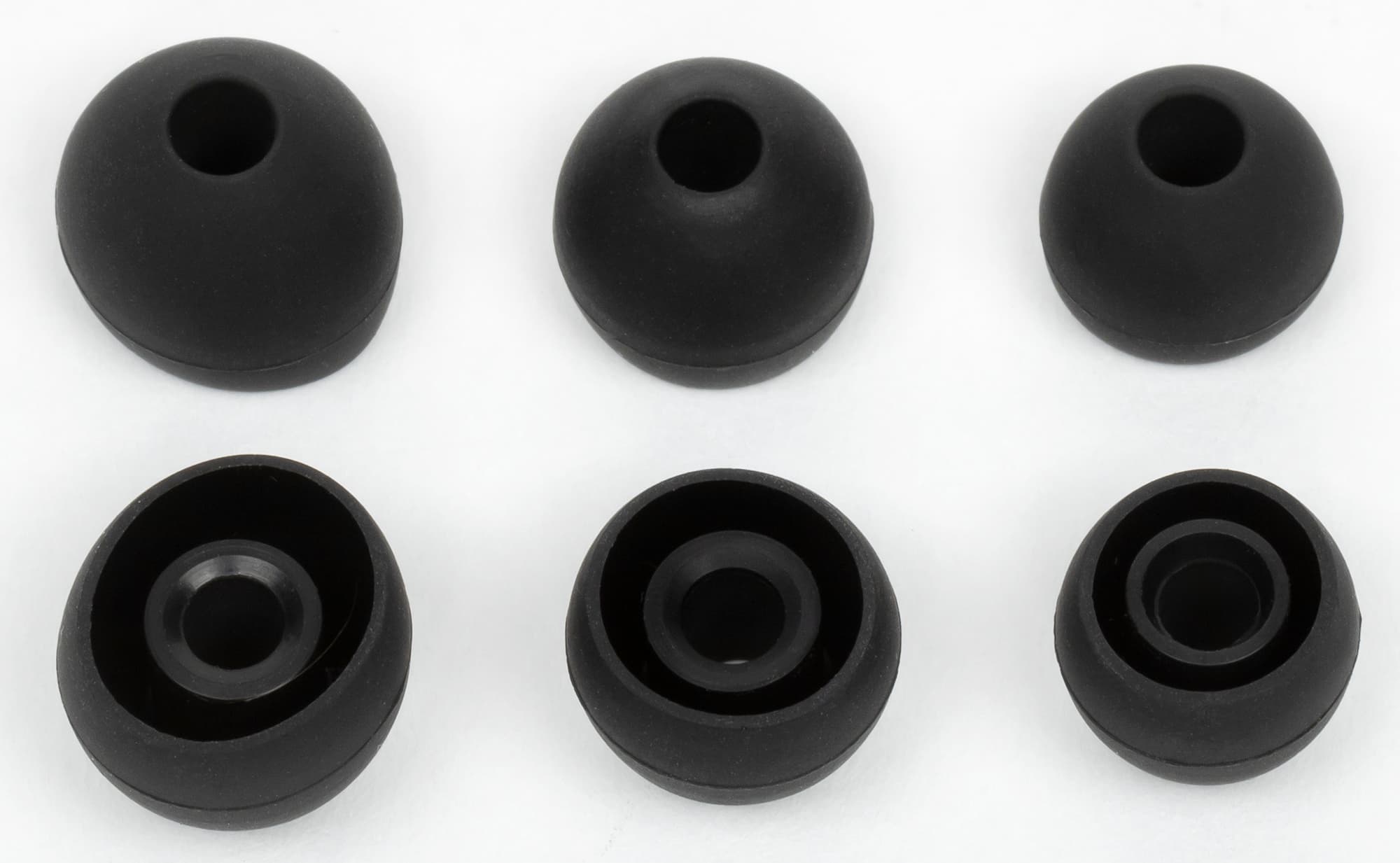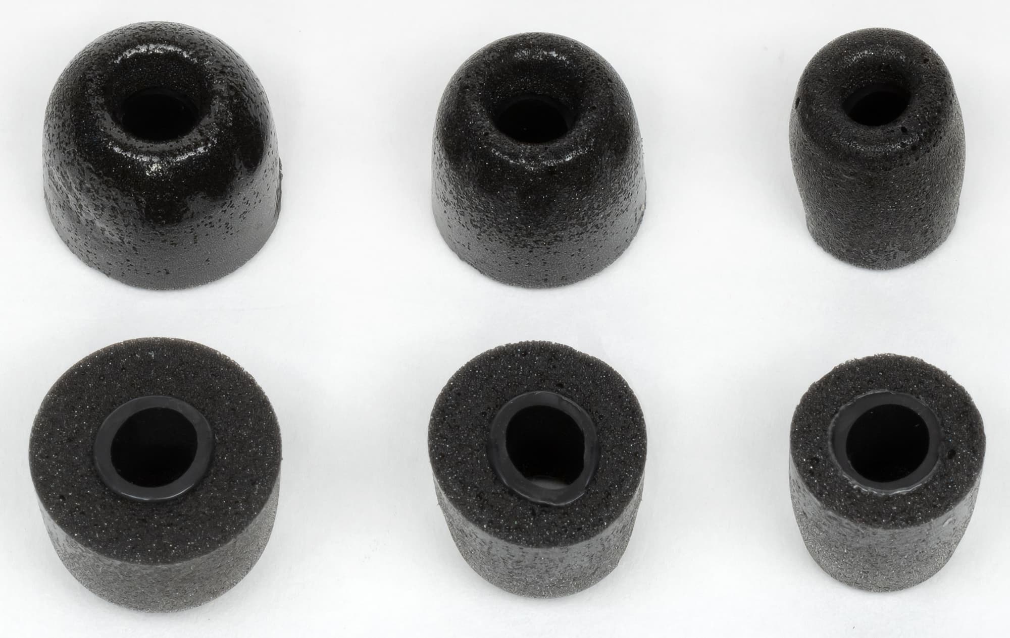 Сменных насадок в комплекте шесть пар: три силиконовых, плюс три из пенного материала. Они стандартные, при желании легко подобрать замену. Хотя особой необходимости в этом нет — к качеству амбушюров, естественно, никаких вопросов не возникает.