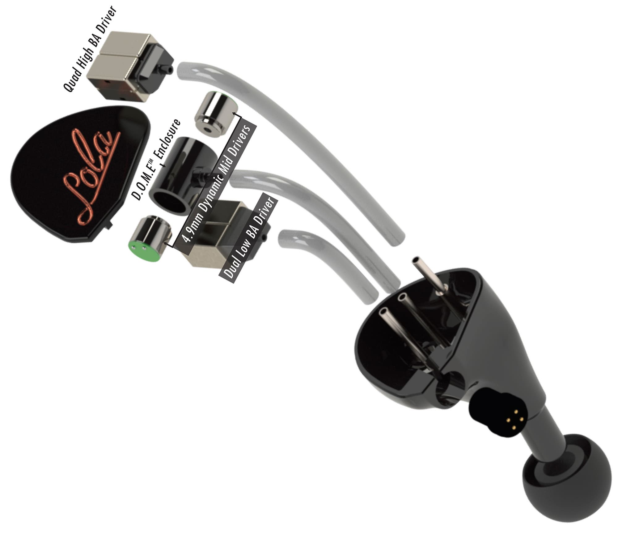 Изначально Джерри Харви и компания делали основной акцент на арматурные решения. В модели Lola было решено реализовать очень популярную ныне гибридную конструкцию, однако сделать это несколько необычным образом. Чаще всего динамический драйвер в гибридах отвечает за воспроизведение низкочастотного диапазона, а вот в JH Audio Lola над ним трудятся сдвоенные арматурные излучатели — по замыслу разработчиков, это должно обеспечить более «быстрый» и детализированный бас.