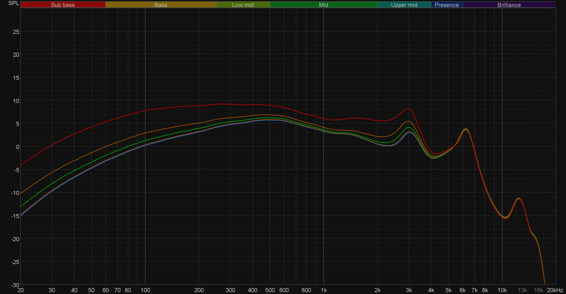 Вот о нем-то мы для начала и поговорим. На корпусе регуляторов есть пять делений — посмотрим на графики АЧХ наушников в каждой из позиций. На слух изменения столь же очевидны, как и на вид — регулировка действительно приносит свои плоды и позволяет весьма серьезно влиять на звучание наушников.
