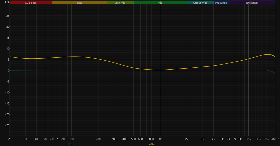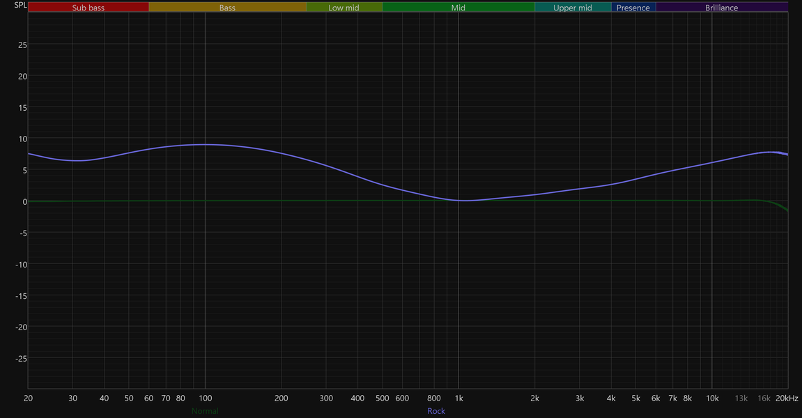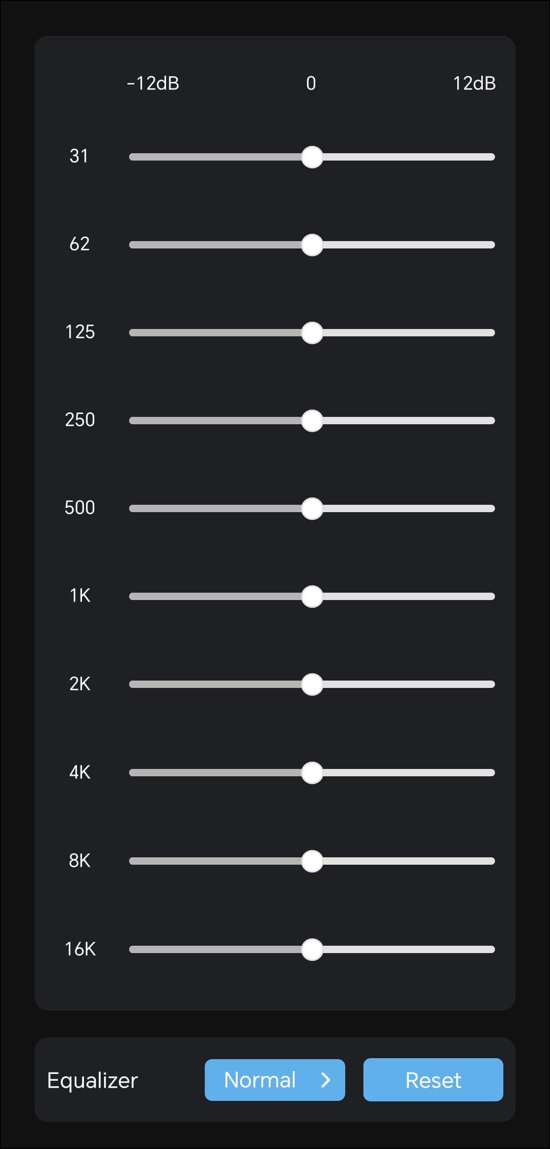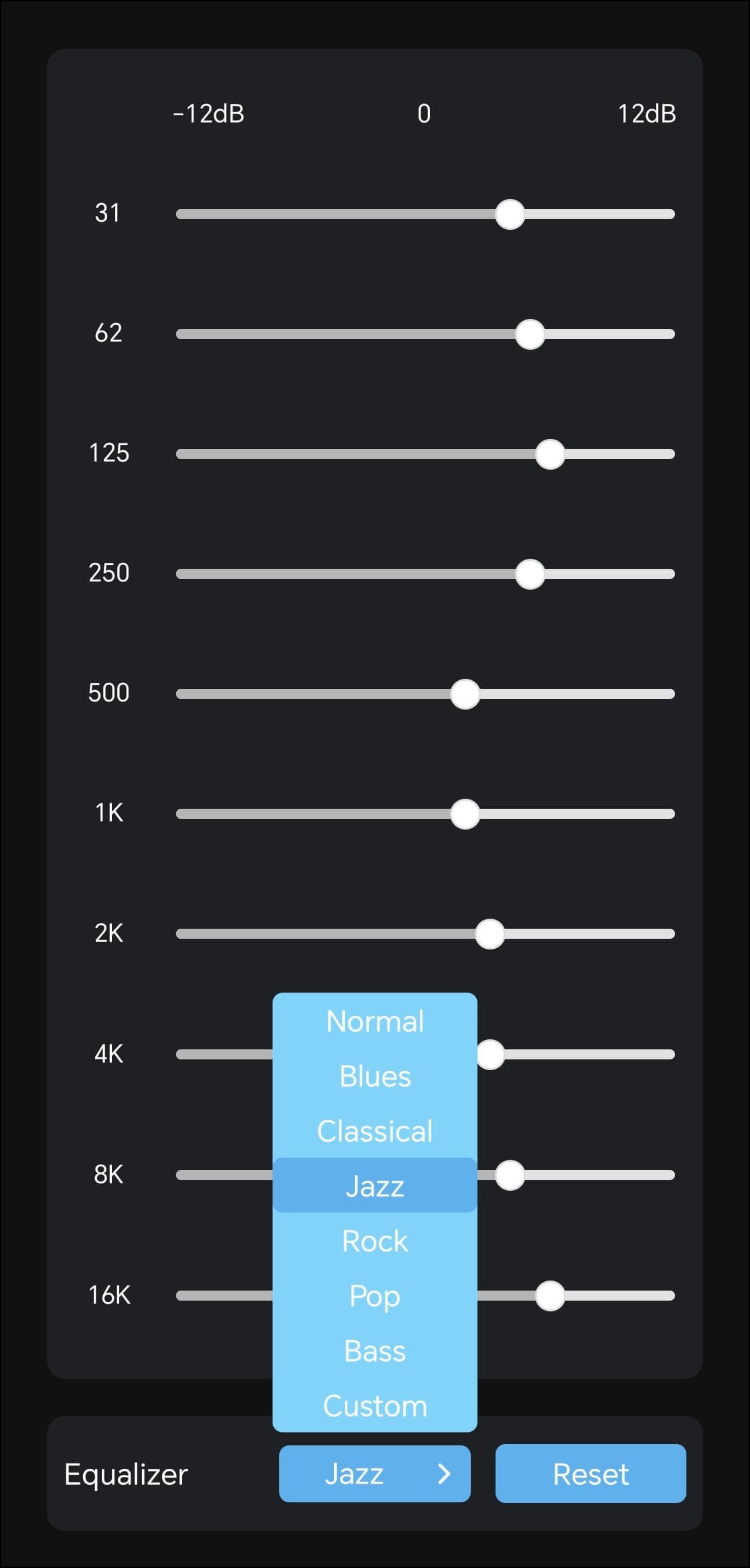 На отдельную страницу вынесен полноценный десятиполосный эквалайзер с заявленным диапазоном работы от −12 до +12 дБ. Доступно семь пресетов: Normal, Classic, Jazz, Rock, Pop, Bass и Blues. При выборе пресета положение полос автоматически меняется, наглядно показывая, какие частоты и в какой степени затрагиваются. Впрочем, куда интереснее создавать собственные настройки. Возможностей эквалайзера вполне хватает, чтобы не только расставить акценты, но и слегка скорректировать особенности звучания используемых наушников.