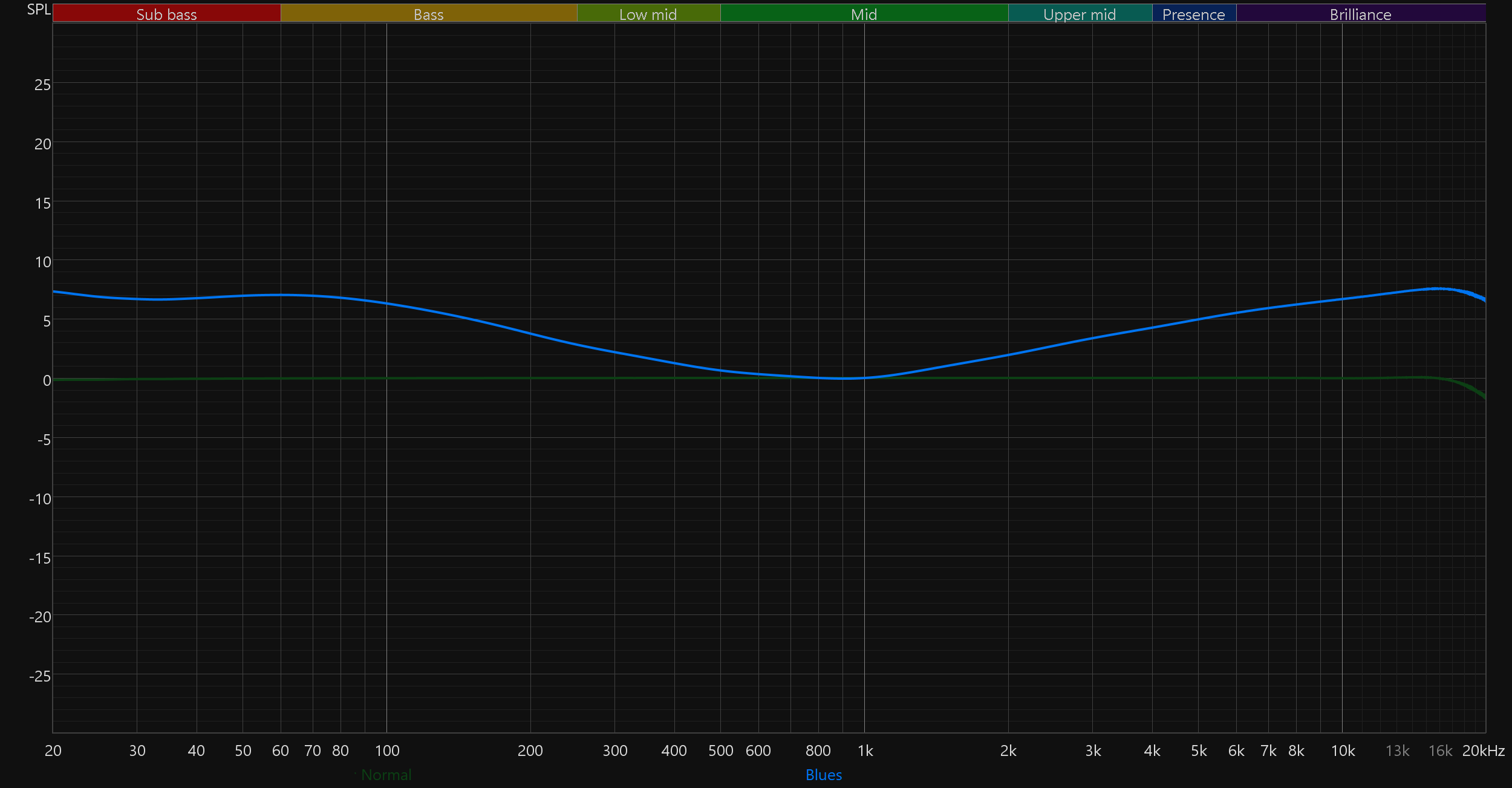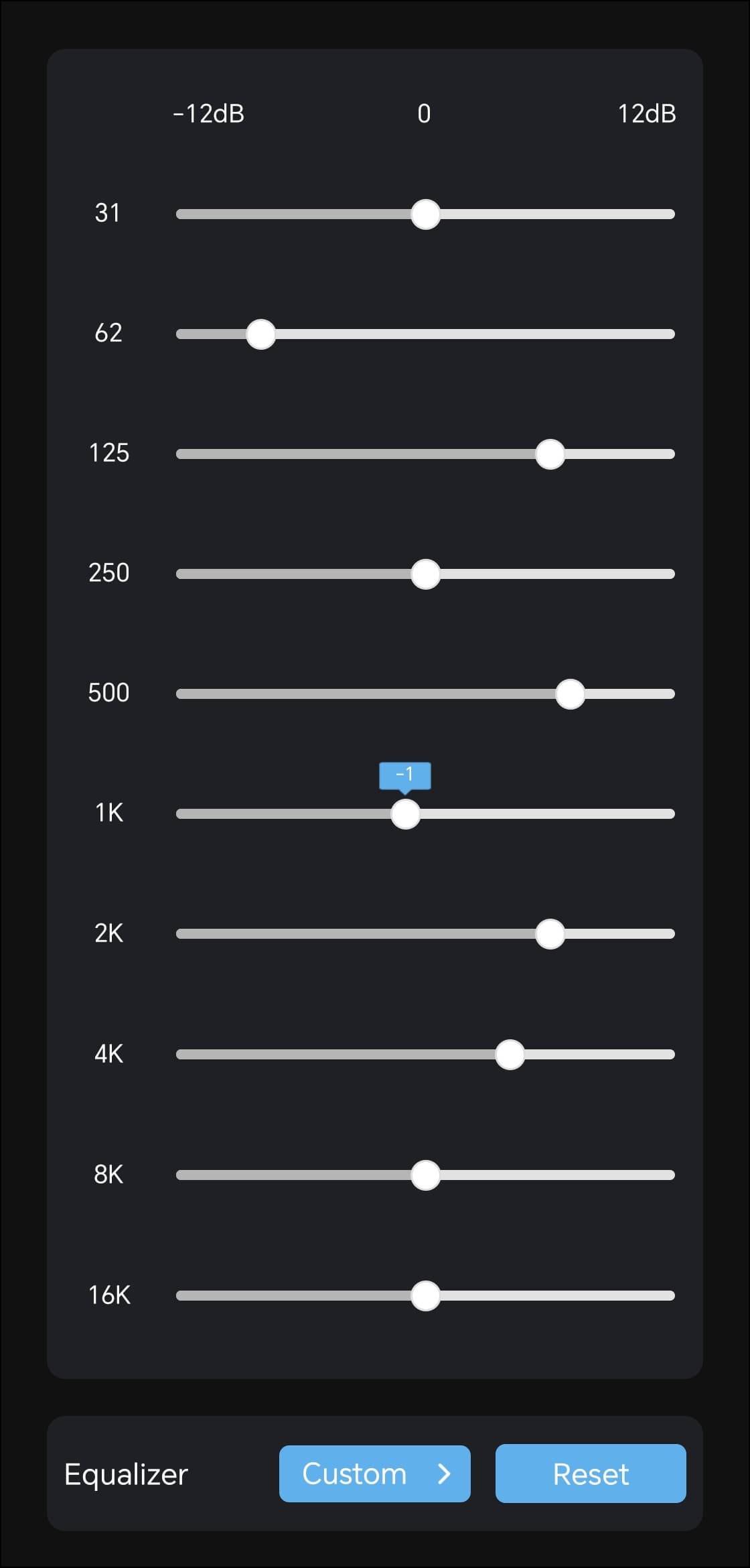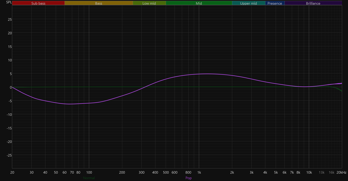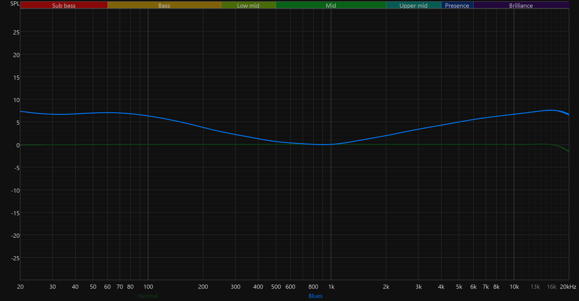 На отдельную страницу вынесен полноценный десятиполосный эквалайзер с заявленным диапазоном работы от −12 до +12 дБ. Доступно семь пресетов: Normal, Classic, Jazz, Rock, Pop, Bass и Blues. При выборе пресета положение полос автоматически меняется, наглядно показывая, какие частоты и в какой степени затрагиваются. Впрочем, куда интереснее создавать собственные настройки. Возможностей эквалайзера вполне хватает, чтобы не только расставить акценты, но и слегка скорректировать особенности звучания используемых наушников.