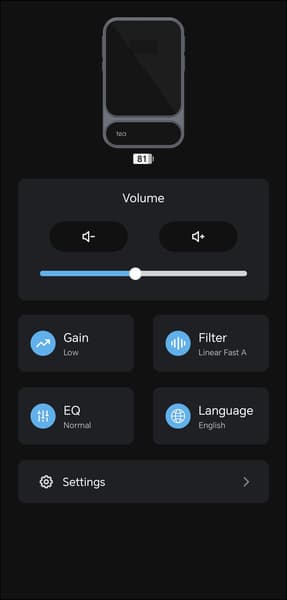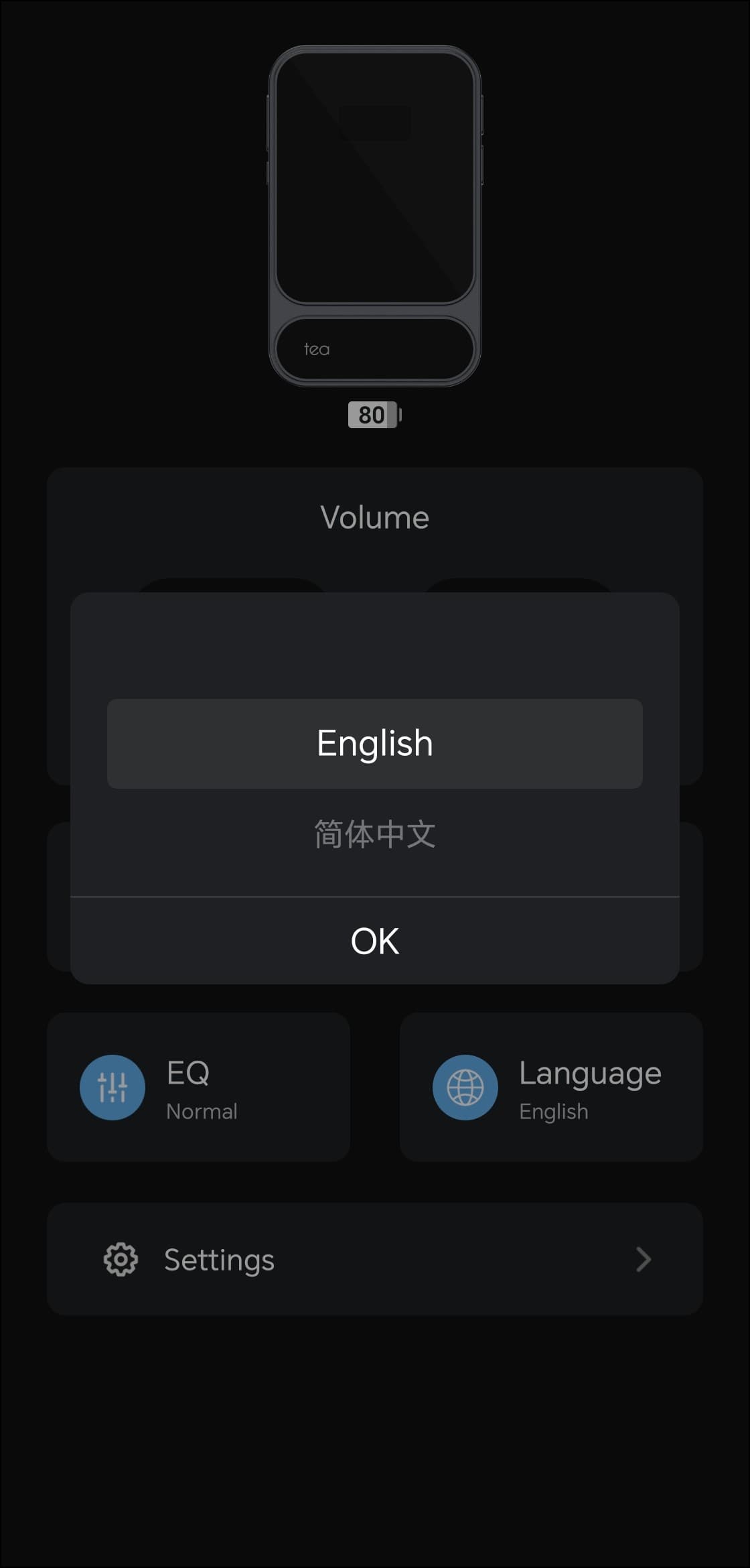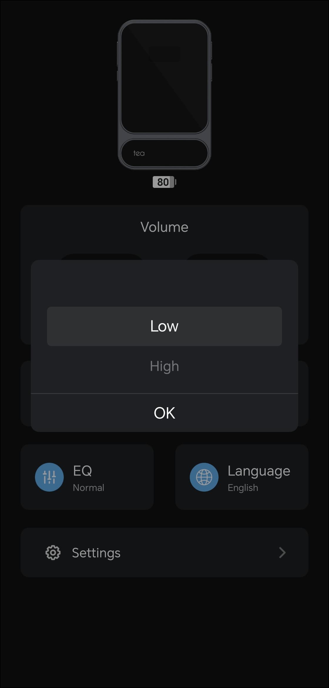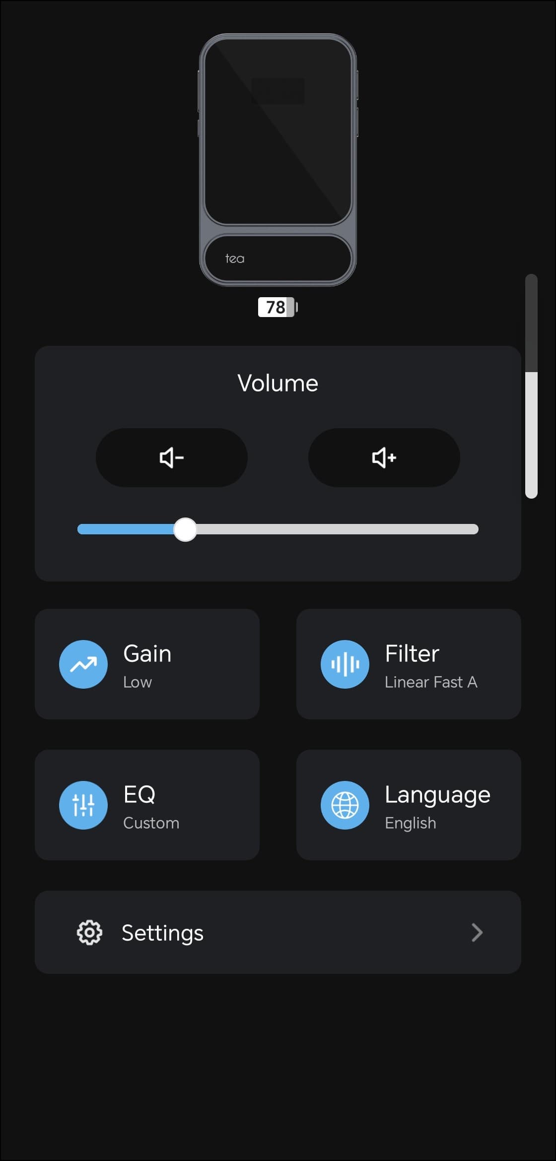 Возвращаемся на главный экран. По центру расположен модуль регулировки громкости, ниже — кнопки быстрого доступа к различным опциям. Первая отвечает за уровень гейна, доступно два варианта: высокий и низкий. Следующая предлагает выбор цифрового фильтра ЦАПа, который слегка влияет на подачу на высоких частотах и в атаке. В еще одном разделе настраивается язык интерфейса, варианта всего два — английский и китайский.