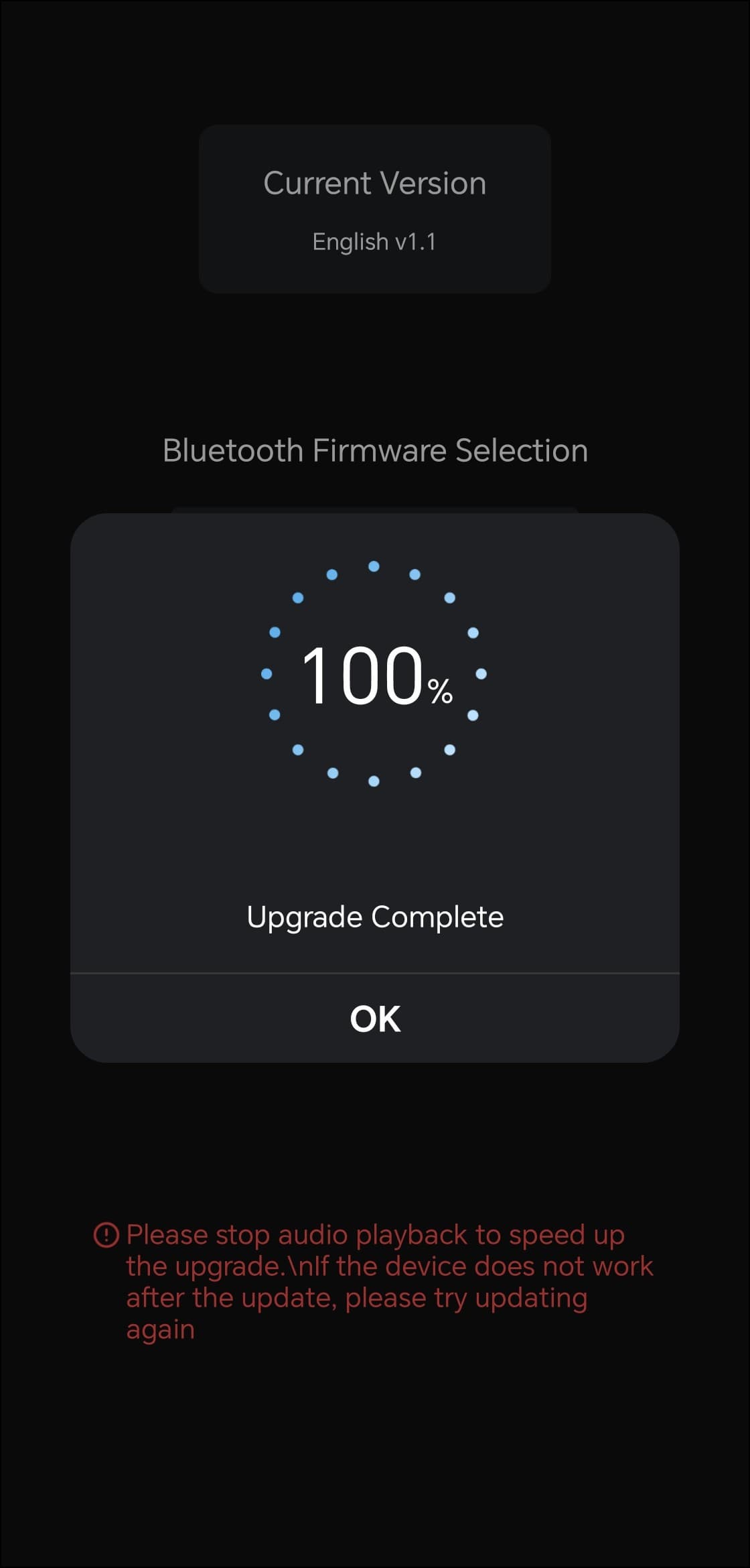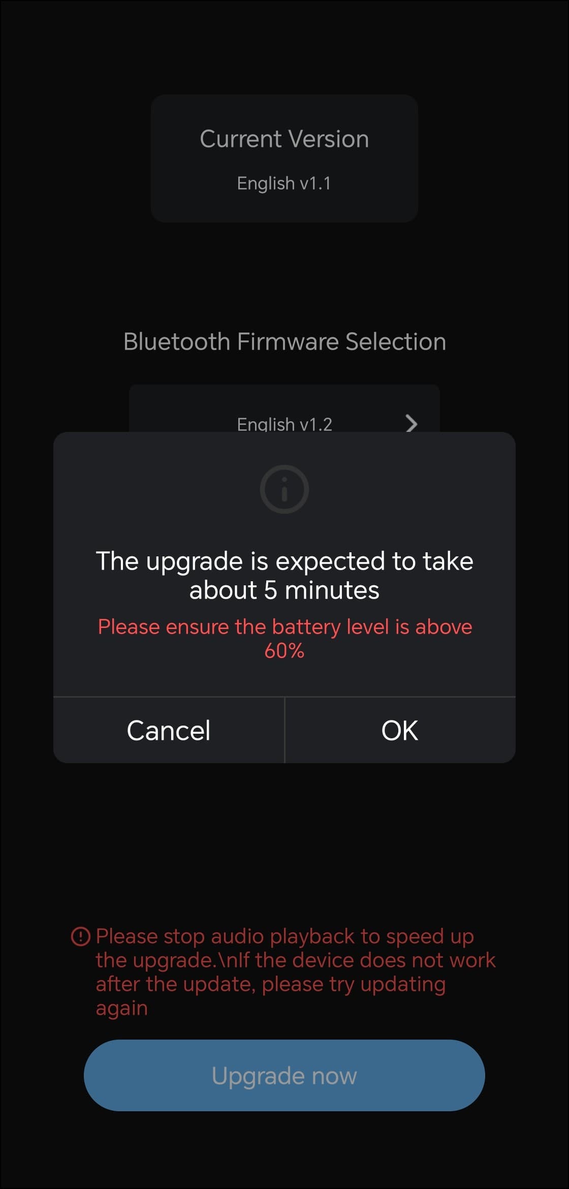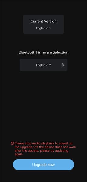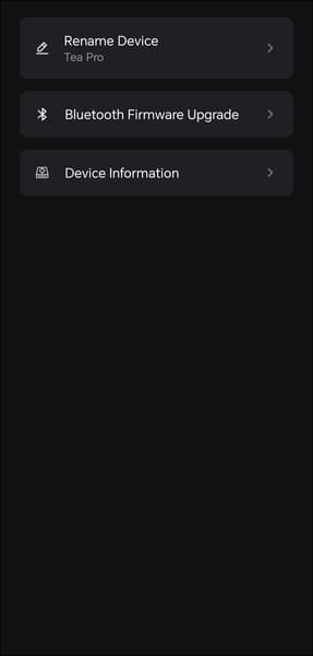 Практически все настройки доступны прямо из меню устройства, но через фирменную утилиту настраивать «цапоусилитель» заметно удобнее. Она называется Khadas Audio и доступна как для Android, так и для iOS. После установки приложение сразу подхватывает подключенное по Bluetooth устройство. На главном экране отображается изображение ЦАПа/усилителя и уровень заряда его аккумулятора. Первым делом сразу переходим в настройки и видим там доступное обновление прошивки.