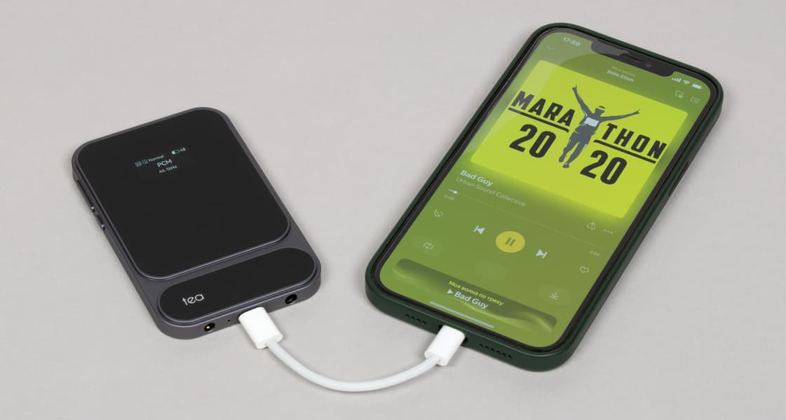 С телефоном Khadas Tea Pro смотрится органично. Комплектный кабель, сложенный вдвое, по размеру почти совпадает с крупными штекерами от наушников — ничего лишнего не торчит. Единственный нюанс: конструкция явно рассчитана на смартфоны с камерой, смещенной в верхнюю часть задней панели. В таком варианте всё помещается вплотную, но без конфликтов. А вот если попытаться прикрепить «цапоусилитель» к устройству с центральной «шайбой», как у некоторых Android-моделей, он может уже не влезть — начнет слегка выступать снизу. В общем, делали явно под iPhone, никто этого особенно и не скрывает.