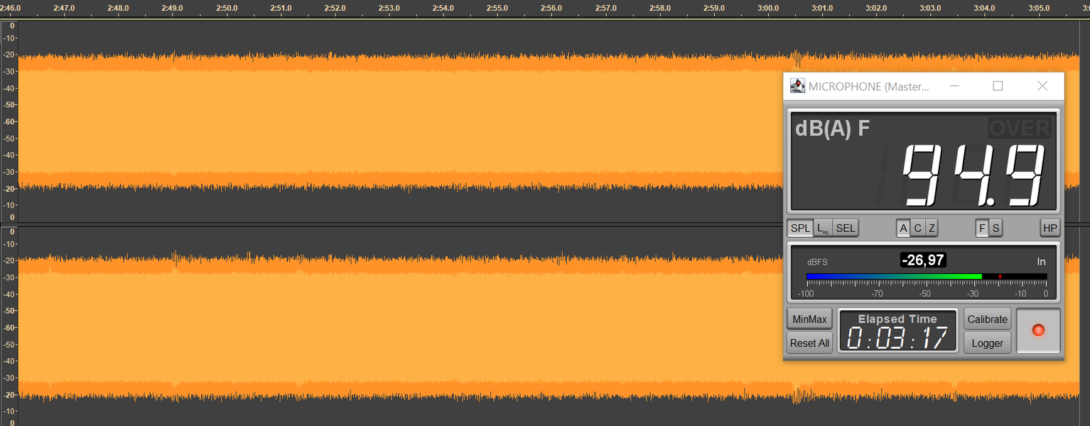 Безопасным уровнем звукового давления при прослушивании музыки считается 75 дБ, но на практике большинство слушателей предпочитает уровень 90-100 дБ. Мы транслируем в наушники белый шум, фиксируя уровень SPL в районе 95 дБ, сразу после старта воспроизведения запускаем запись сигнала с измерительного стенда.