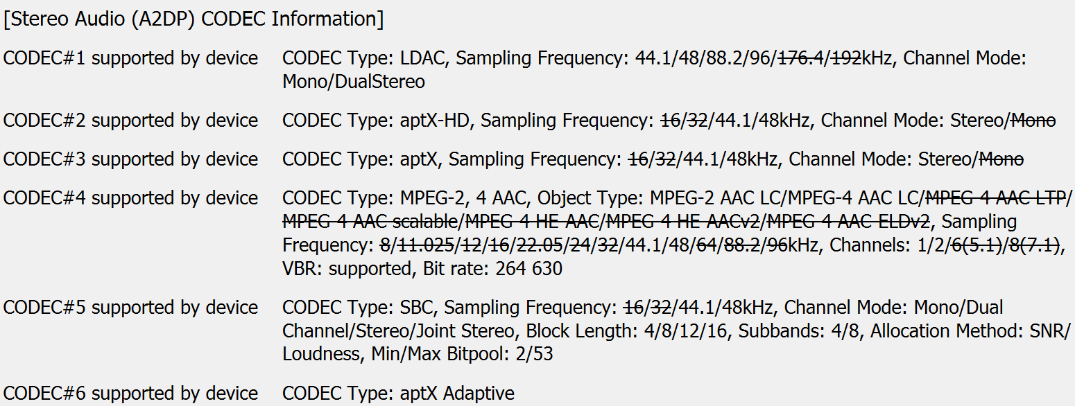 Все как заявлено: SBC AAC, aptX, aptX adaptive, aptX HD, LDAC. При этом параметр Bitpool у SBC выставлен на уровне 53, что даже чуть выше значения, указанного в рекомендованном профиле High Quality. Верхний порог битрейта у AAC — 264 Кбит/с, так что оба «базовых» кодека покажут все, на что способны.