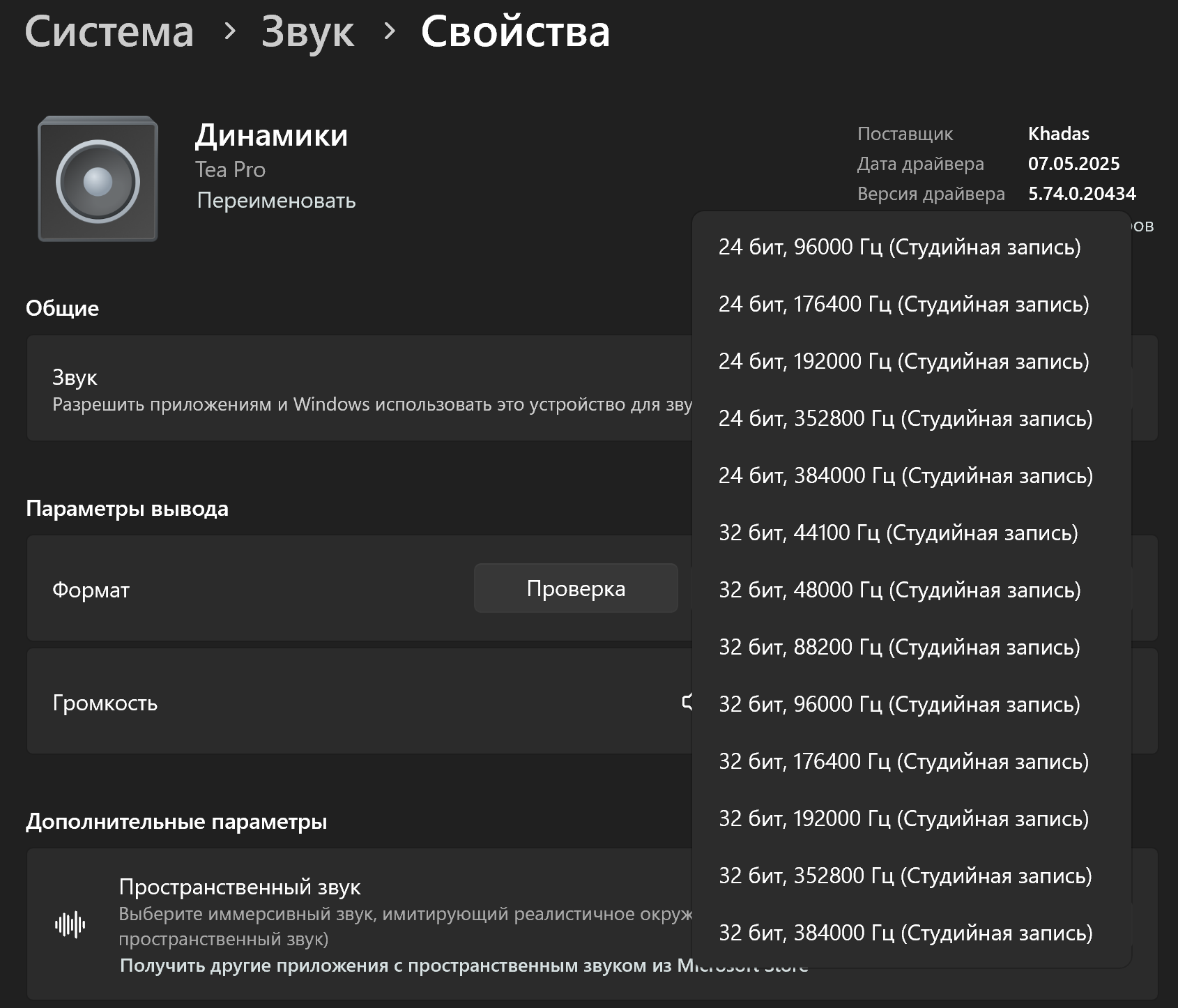 После подключения к ПК под управлением Windows 11 ЦАП/усилитель определяется системой сразу, но максимальное доступное разрешение по умолчанию ограничено 24 бит и 48 кГц. Для воспроизведения «хайрезов» потребуется установить фирменный драйвер с сайта производителя. После этого становится доступна поддержка вплоть до 32 бит и 384 кГц.
