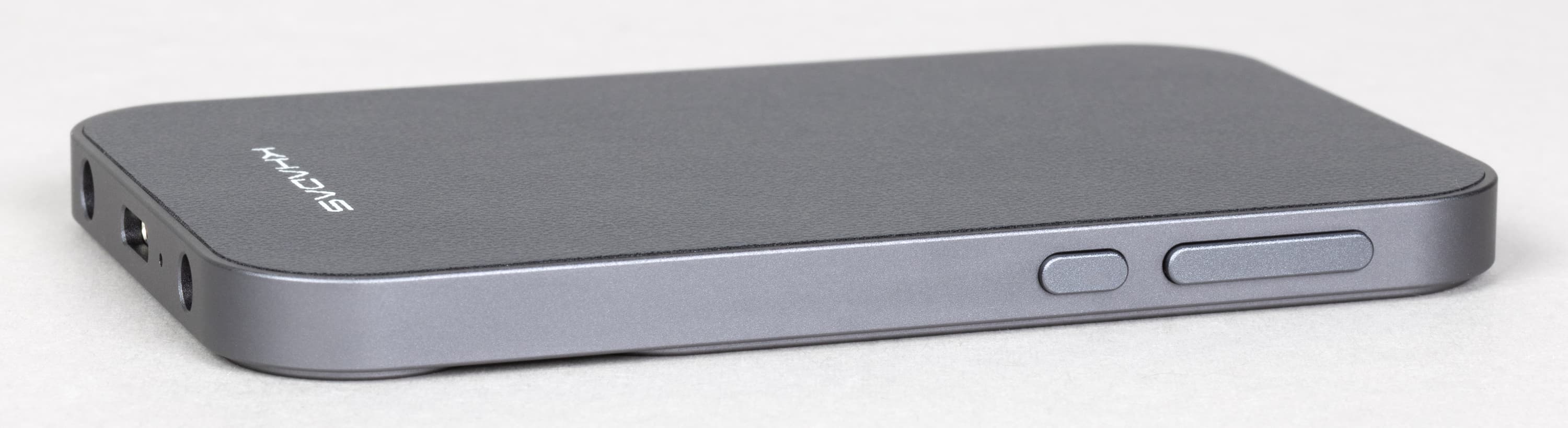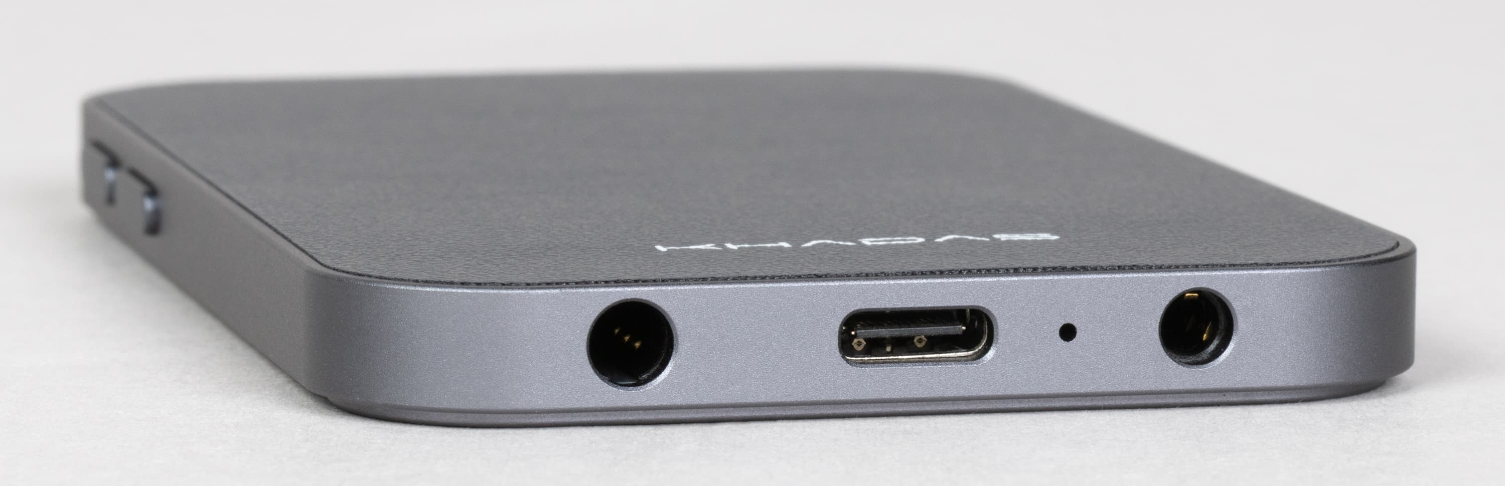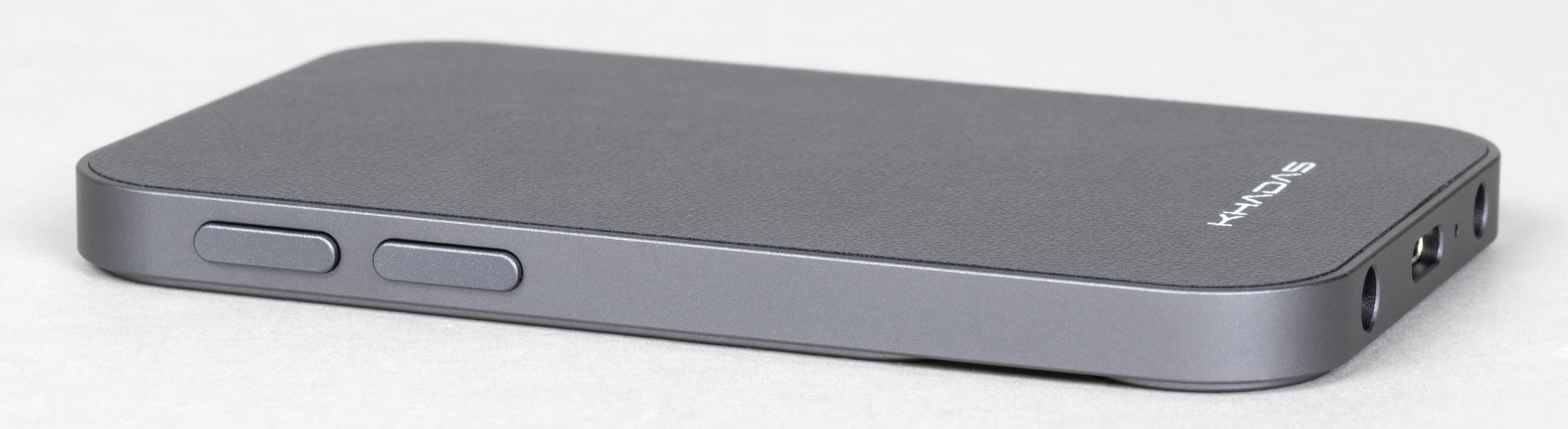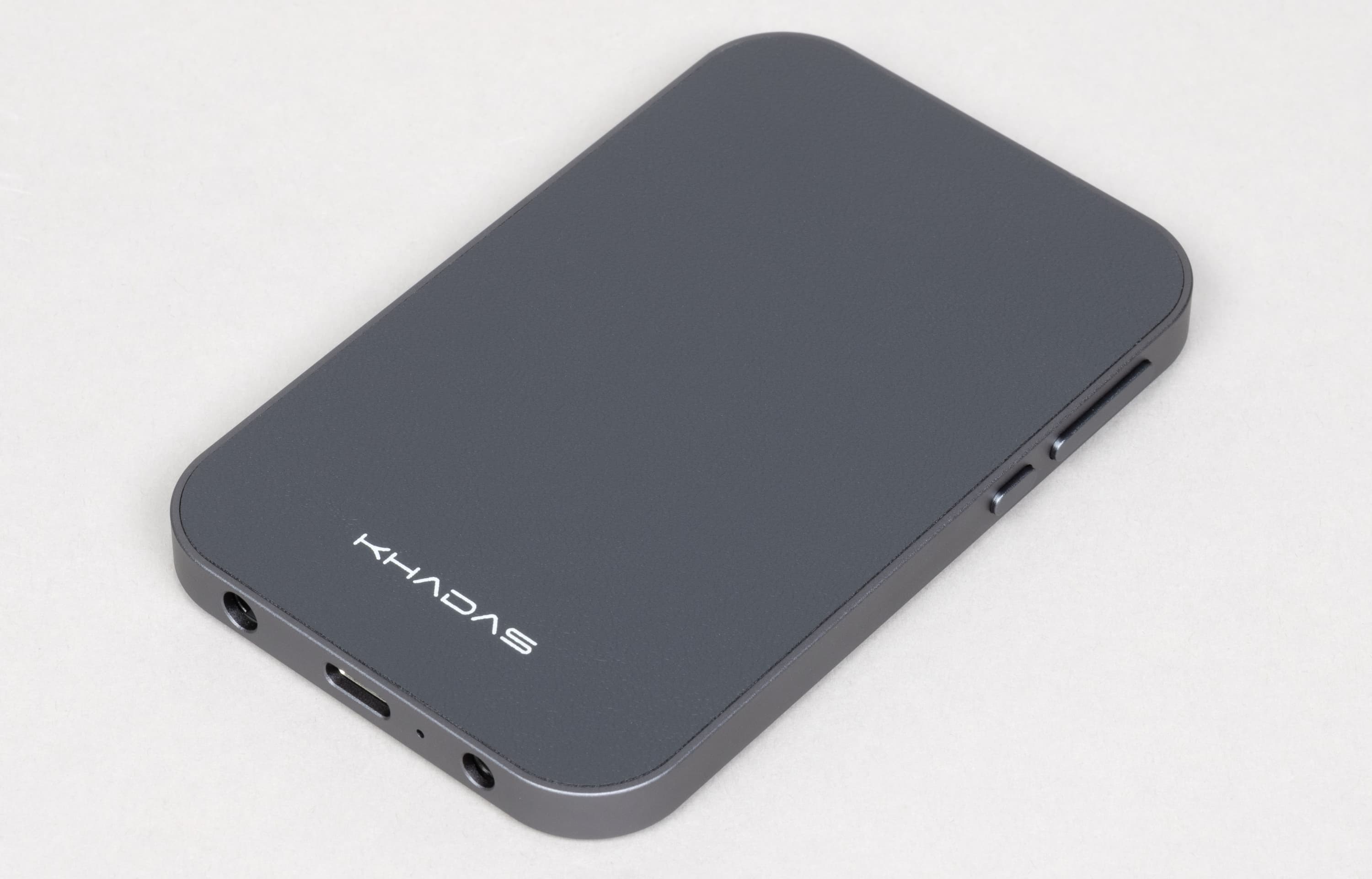 Дизайн Khadas Tea Pro настраивает на восприятие его как продолжения смартфона, а не как отдельного устройства. Судя по всему, разработчики именно этого и добивались: пропорции корпуса и скругления заметно перекликаются с актуальными моделями телефонов, благодаря чему устройство не выглядит чужеродно на задней панели. Поставляется усилитель в единственном варианте оформления — металлическом сером, который довольно органично сочетается со смартфонами разных цветов.