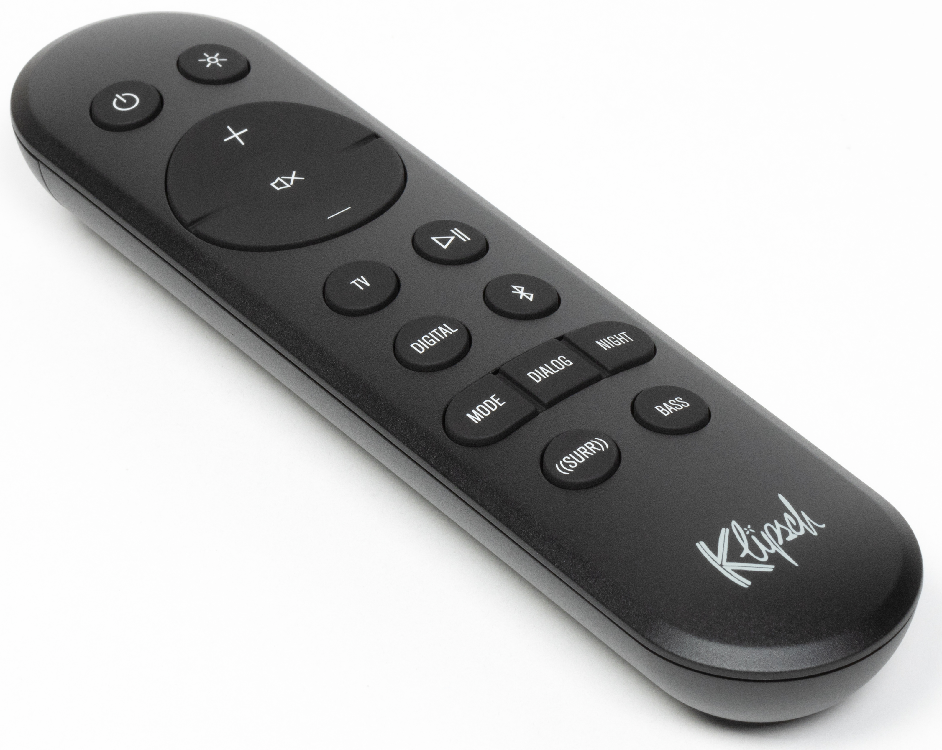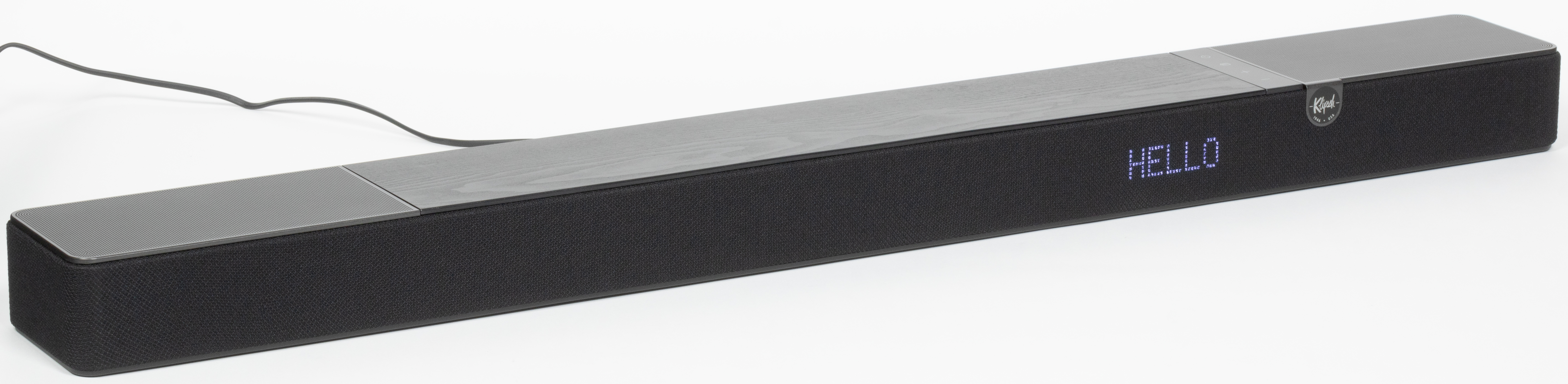 Ближе к правому верхнему углу расположен единственный декоративный элемент — логотип Klipsch. На верхней панели рядом с ним находится небольшая сенсорная панель управления.
