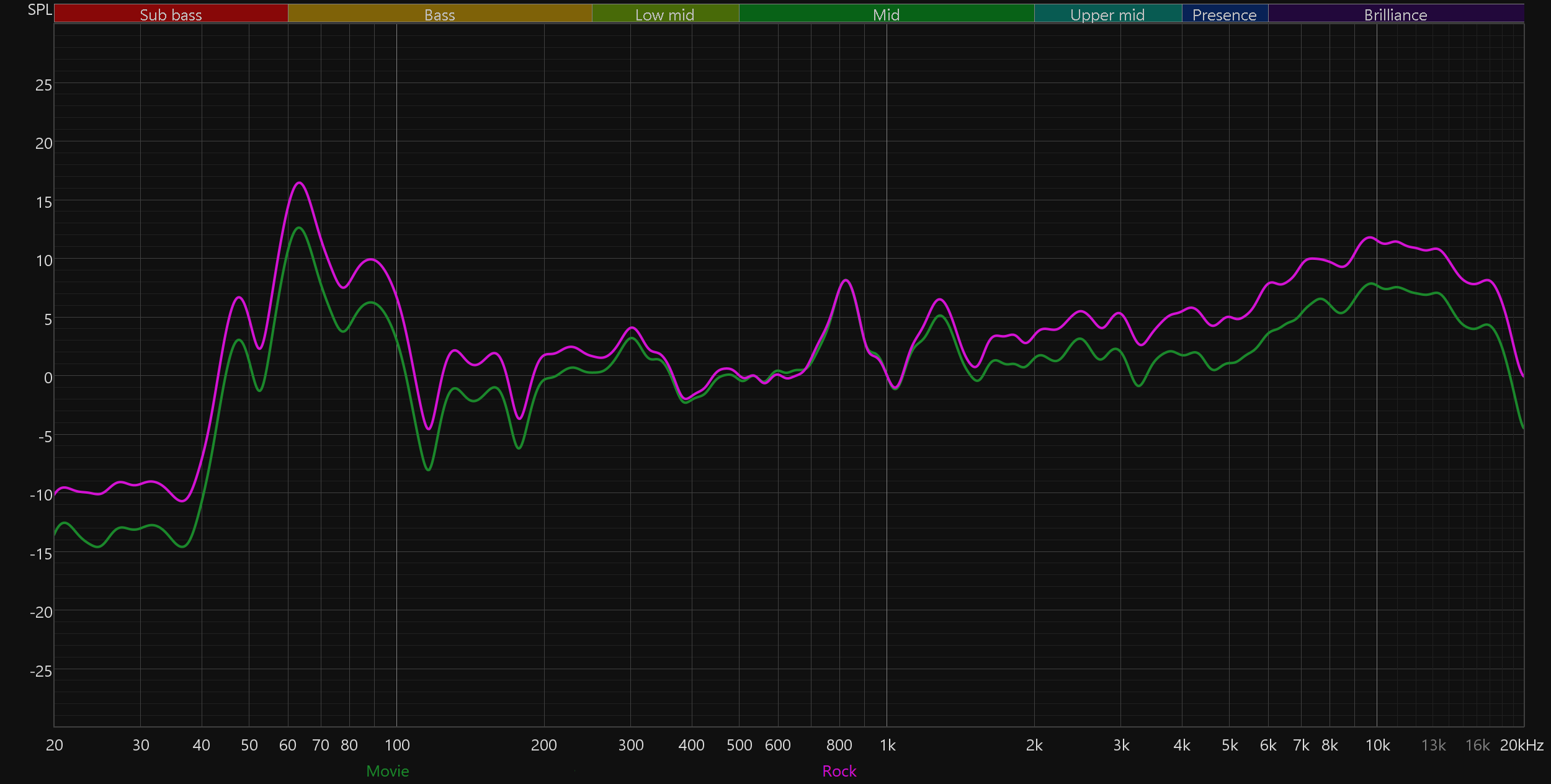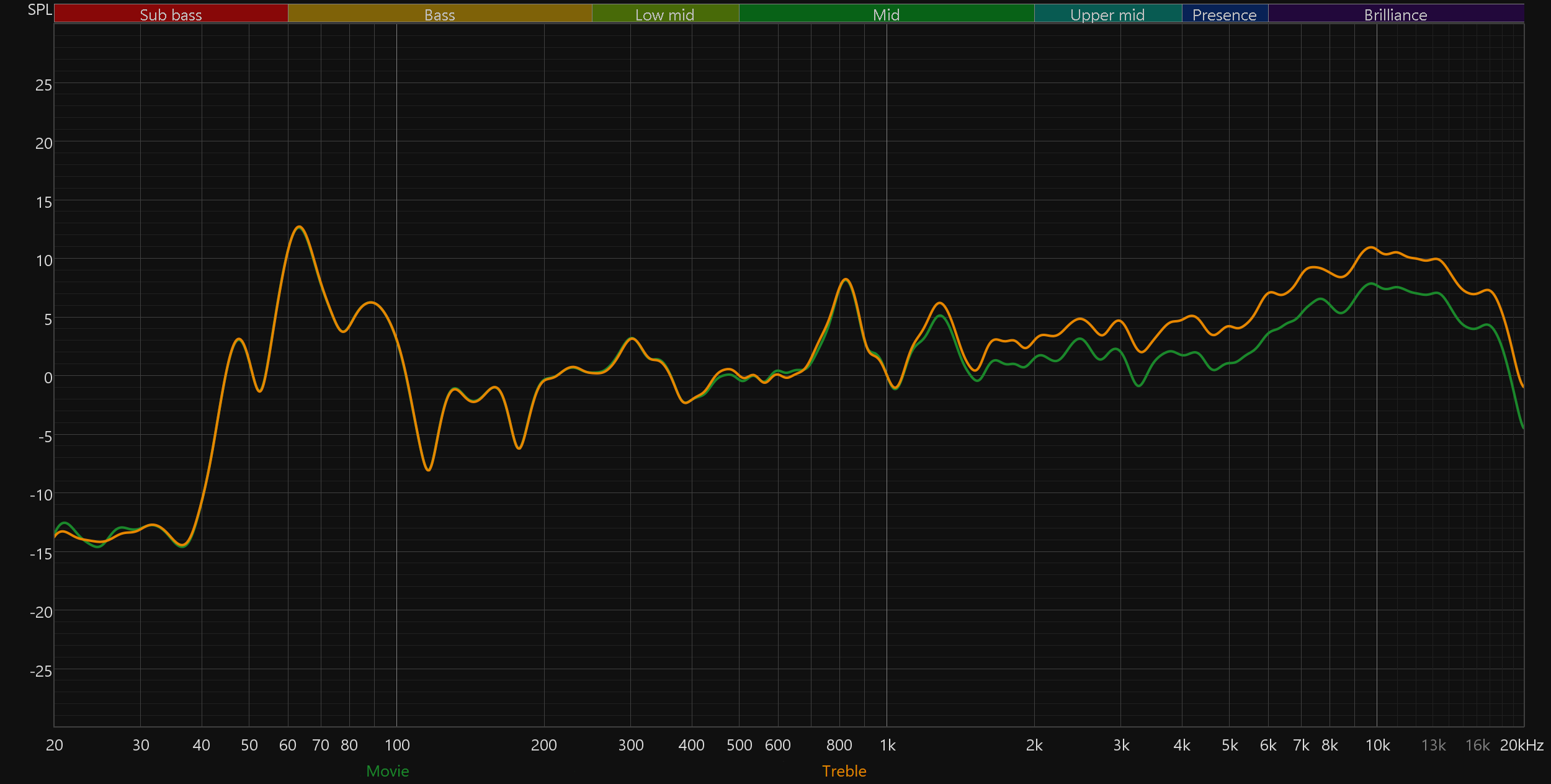 Переключение режимов «Музыка» и «Фильм» почти не влияет на тональный баланс — настраивают они, по всей видимости, уровни громкости каналов и добавляемую задержку звука для создания эффекта окружающего звука. В режиме «Музыка» акцент делается на стереозвучание и расширение так называемой «виртуальной сцены», в режиме «Фильм» — на более яркое восприятие «движения» звуковых эффектов вокруг слушателя.