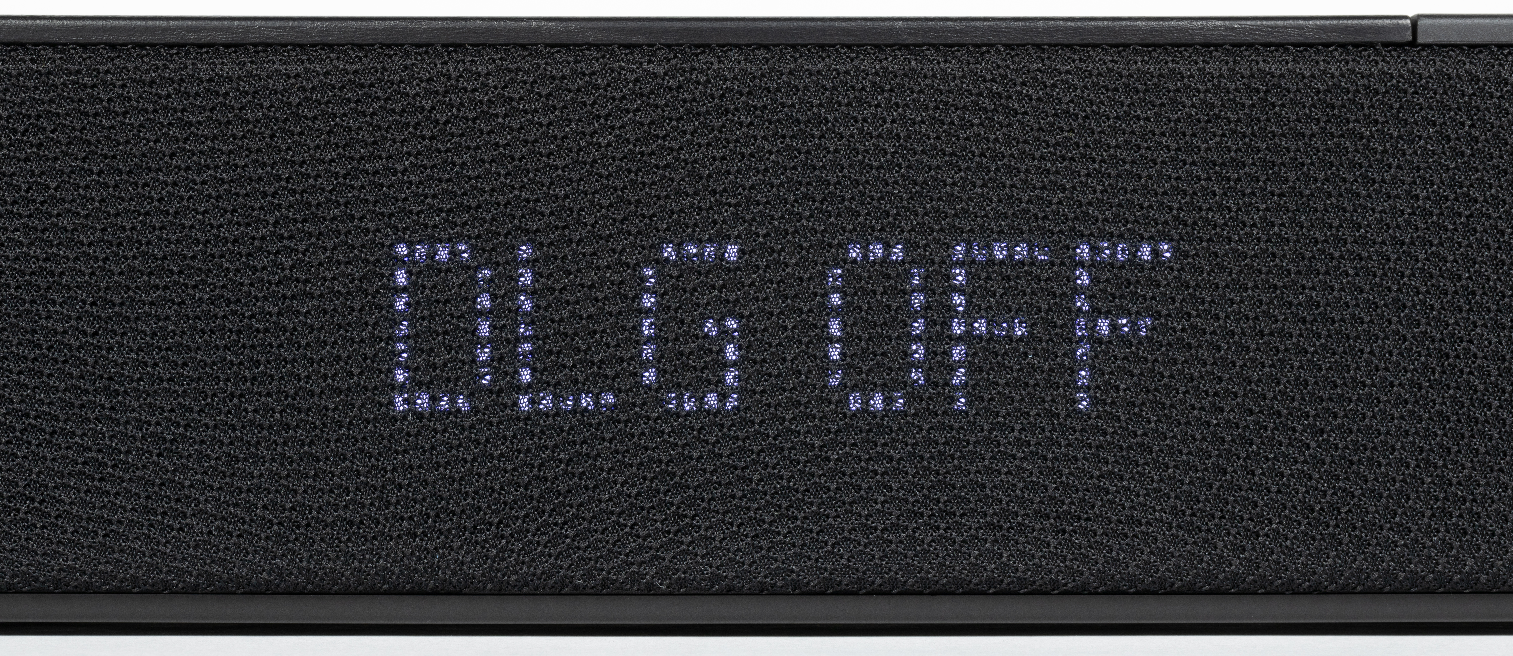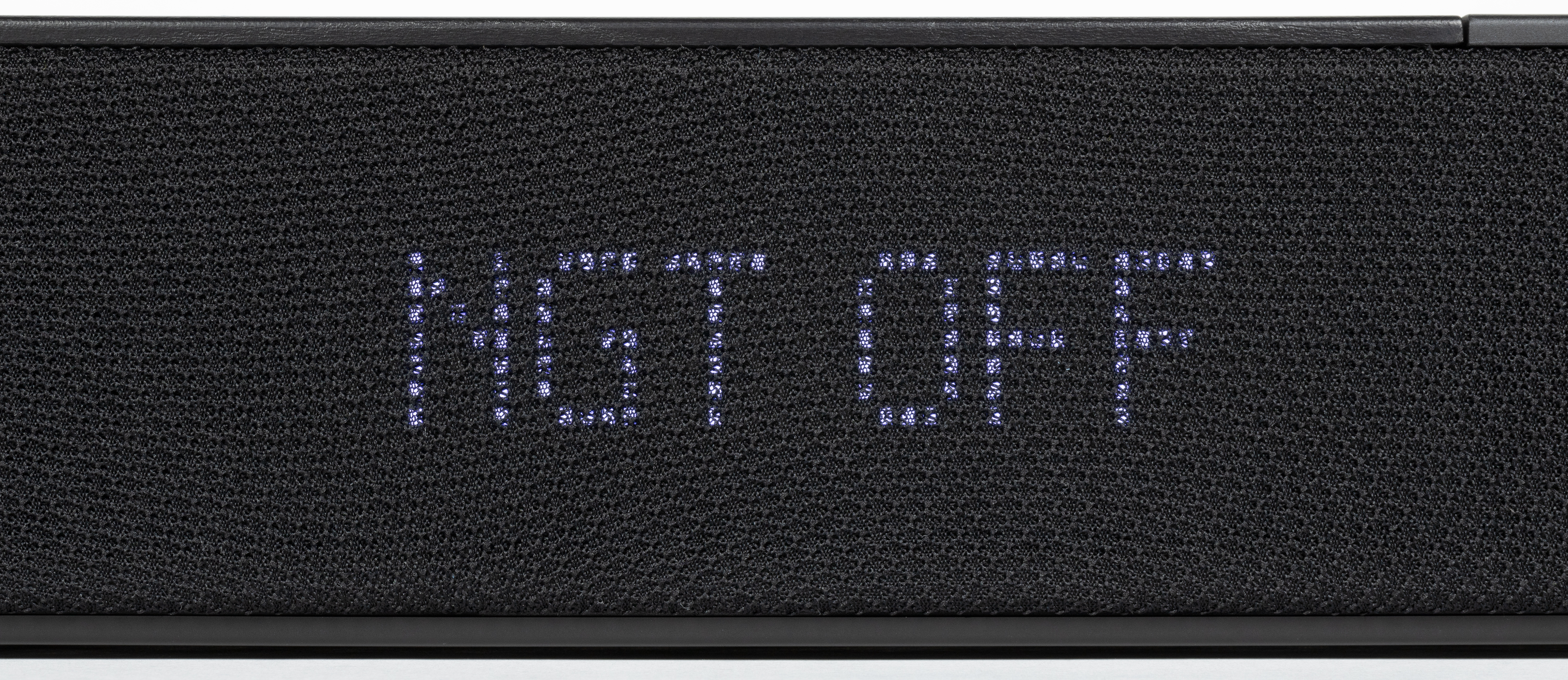 По периметру саундбар обтянут звукопрозрачной тканью, на передней панели за ней находятся фронтальные динамики. Все поверхности устойчивы к появлению загрязнений, при необходимости довольно просто очищаются.