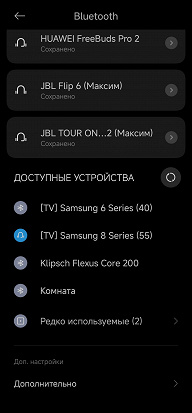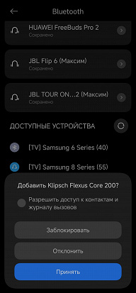 В основном для трансляции аудиоконтента с внешних источников, конечно же, будут использоваться мобильные гаджеты, подключенные посредством Bluetooth. После запуска Bluetooth-подключения Klipsch Flexus Core 200 некоторое время пытается соединиться с уже «знакомыми» устройствами, если не получается — переходит в режим сопряжения. Остается найти его в соответствующем меню используемого смартфона и подключить.
