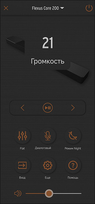 Управлять саундбаром можно несколькими способами, велика вероятность, что многие пользователи предпочтут при повседневной эксплуатации пользоваться ПДУ от других устройств — ТВ или медиаприставки, но собственный пульт у Klipsch Flexus Core 200 тоже имеется. Он позволяет изменить все базовые настройки: громкость, активный вход, профиль звучания. яркость экрана на саундбаре. Есть доступ и к опции изменения баланса громкостей колонок в системе и части настроек темброблока. В руке пульт лежит удобно, клавиши нажимаются очень мягко, но при этом с ощутимым кликом. Кнопки громкости вынесены на «кольцо» в верхней части, их очень легко найти на ощупь.