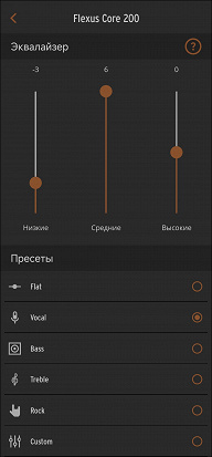 Пресеты эквалайзера делают ровно то, что ожидаешь, исходя из их названия: Vocal — выделяет середину, Bass — НЧ-диапазон, Treble — высокие. Ну а Rock поднимает края диапазона — почему-то очень многие производители считают, что именно так нужно слушать рок-музыку.