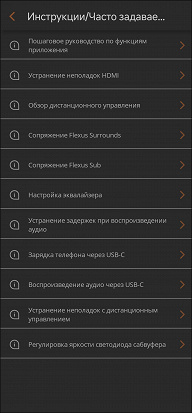 Громкость каждого из устройств в системе можно настроить отдельно, что позволит адаптировать ее под особенности помещения и положение слушателей. Измерительного микрофона в комплекте и системы автонастройки нет — немного жаль, об этом мы еще поговорим чуть ниже. Также из общего меню доступны еще два режима звучания: «фильм» и «музыка».