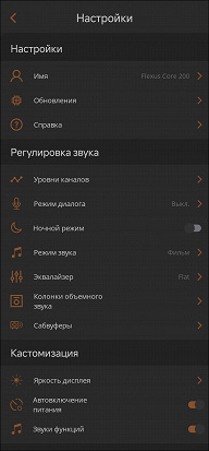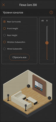 Вероятнее всего, какая-нибудь система автонастройки звука под помещение сделала бы объемное звучание еще более впечатляющим, но ее в Klipsch Flexus Core 200 нет. Придется всё брать в свои руки: ставить приложение и настраивать громкость всех каналов, пытаясь добиться сбалансированного их звучания. Можно использовать специальный «тестовый контент» или просто знакомые фильмы. Потребуется некоторое время на эксперименты, но результат потенциально может быть очень хорошим — в конце концов, задачи сделать всё идеально тут нет, лишь бы было интересно и комфортно слушателям. Настроек у Klipsch Flexus Core 200 множество, посмотреть на его работу во всех их сочетаниях не представляется возможным, так что сконцентрируемся на основных.