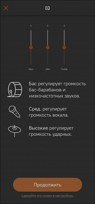 По центру главного экрана размещен модуль управления воспроизведением, позволяющий и ставить треки на паузу, и перелистывать их в обоих направлениях. Регулятор громкости вынесен в самый низ, что не очень удобно — дотянуться до него пальцем той же руки, что удерживает смартфон, тяжеловато. Встроенный эквалайзер предлагает несколько пресетов, плюс три полосы для создания своих. Прямо скажем, три — это крайне немного, но они есть — уже хорошо.