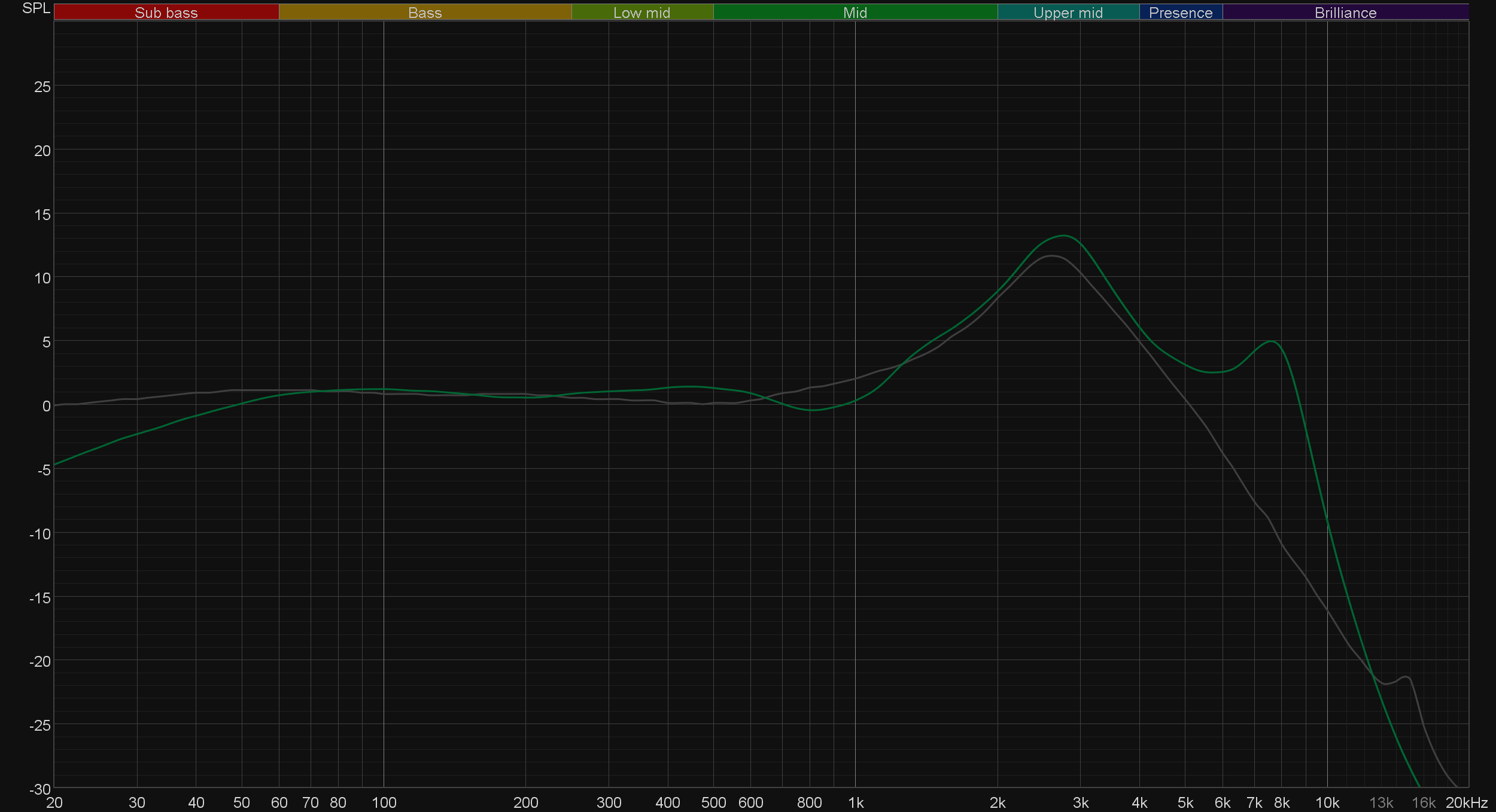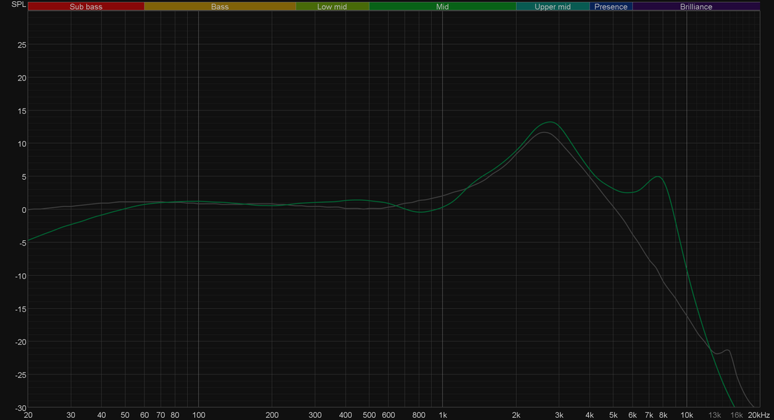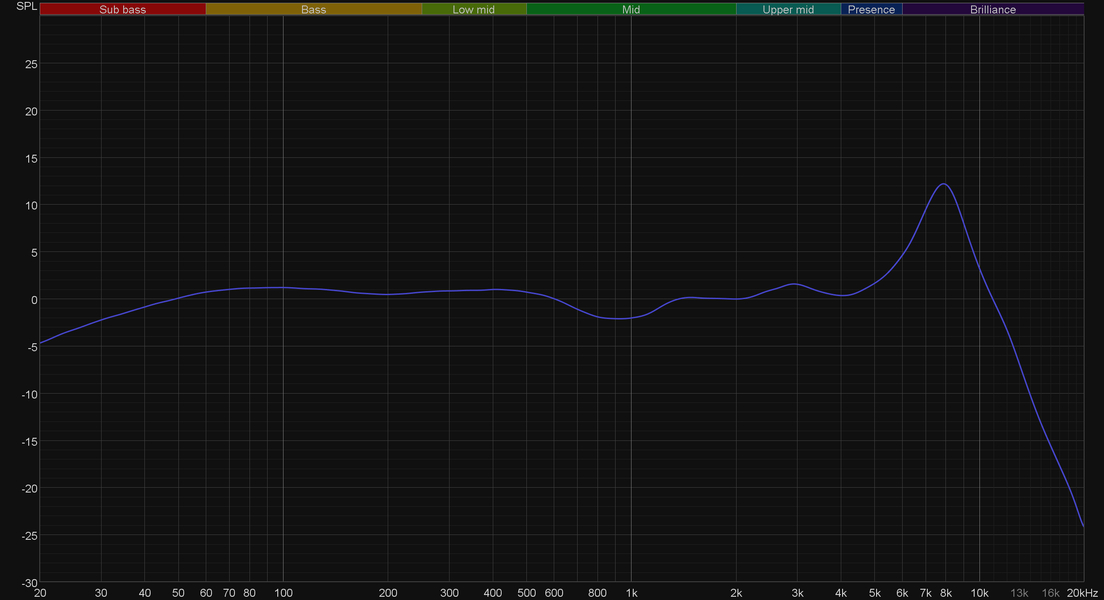 График АЧХ показан на фоне целевой кривой, предоставленной производителем используемого стенда. Она является адаптированным под конкретное устройство аналогом так называемой «кривой Хармана», созданной командой Harman International под руководством доктора Шона Олива. Люди неодинаково воспринимают звук разной частоты, поэтому даже самые точные измерения могут не соответствовать реальному пользовательскому опыту. Для компенсации этих различий и используется целевая АЧХ. Близкое к ней звучание оценивалось сотнями участников экспериментов как нейтральное, сбалансированное, естественное и так далее.
