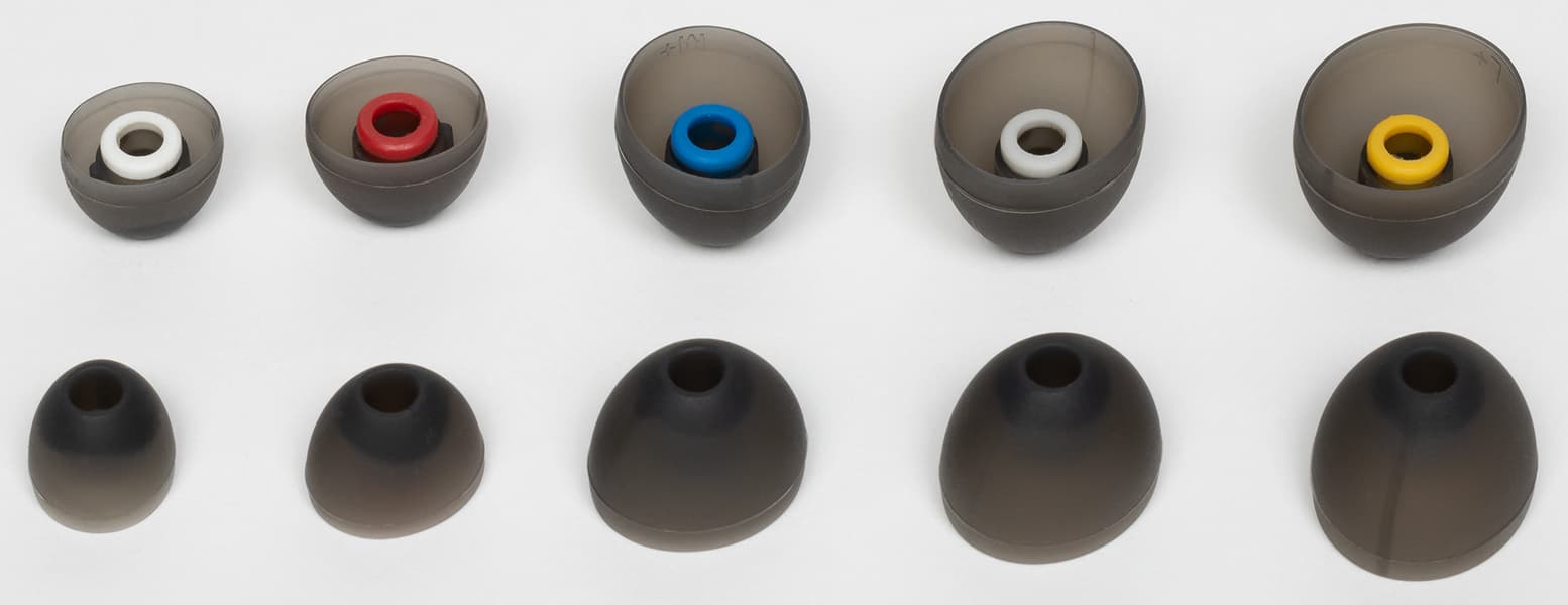А терять силиконовые насадки точно не стоит — они проприетарные и подобрать замену будет сложно. В отличие от большинства известных нам амбушюров они не обхватывают носик звуковода сверху, а помещаются вовнутрь. Каждый из размеров промаркирован своим цветом сердечника, что удобно и позволяет быстро сориентироваться при замене.