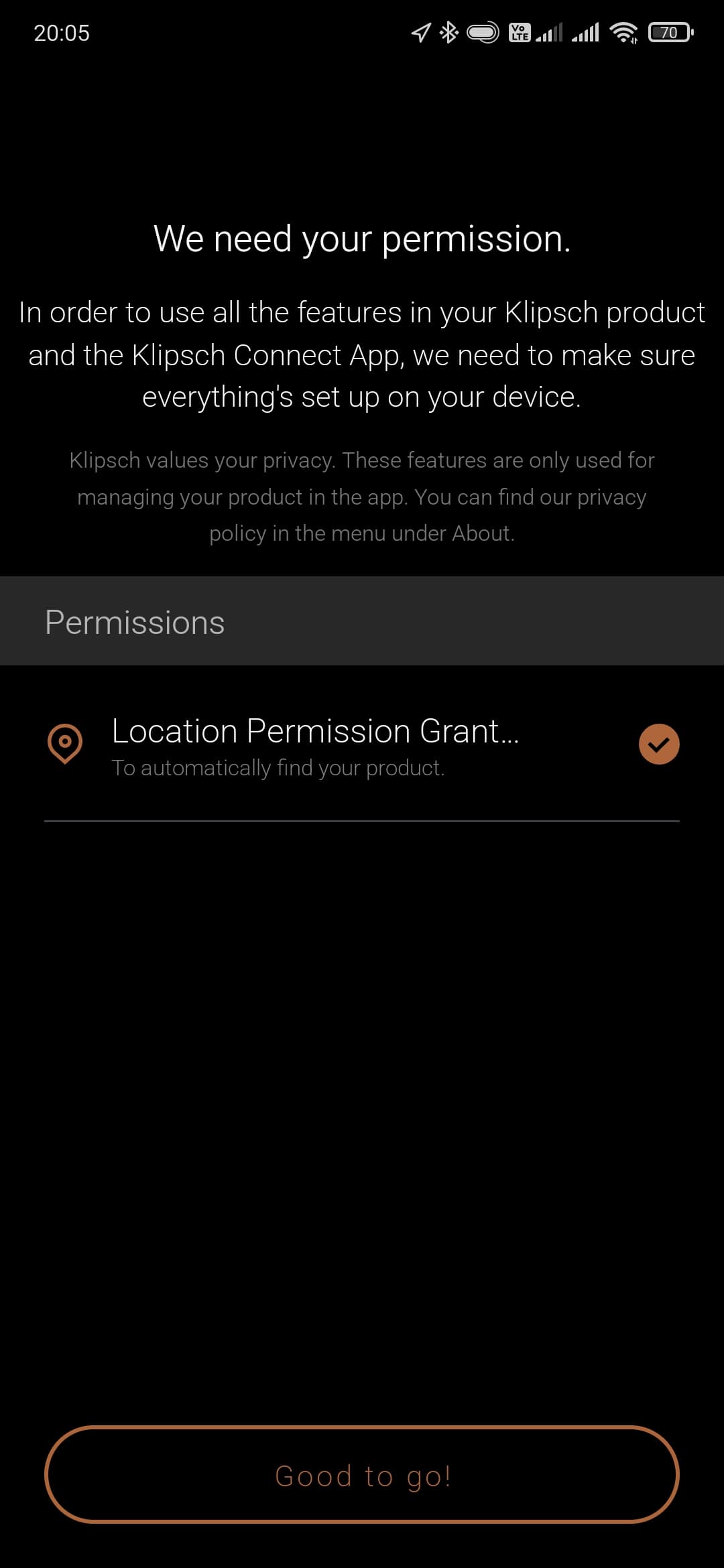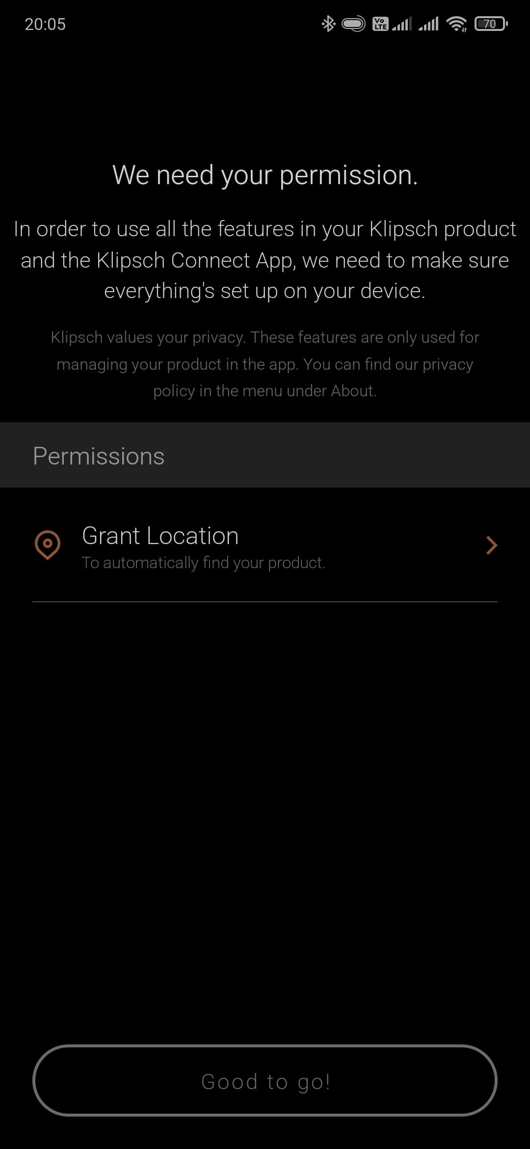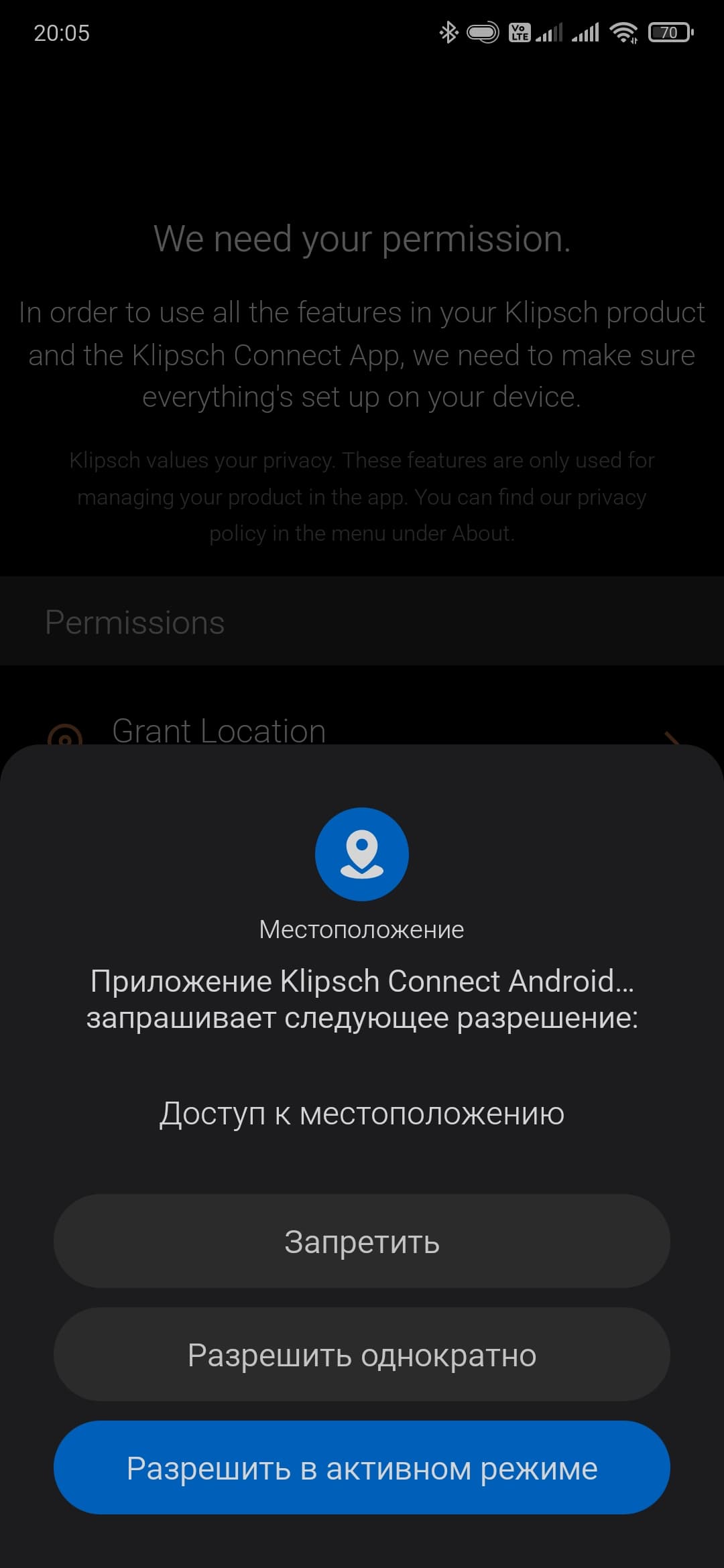 Ну и финальным этапом подключения и настройки можно считать установку ПО Klipsch Connect App, доступного под Android и iOS. Без него, конечно, все тоже будет работать. Но с ним намного интереснее и удобнее. Устанавливаем, по желанию — даем доступ к местоположению, непременно соглашаемся с условиями использования…