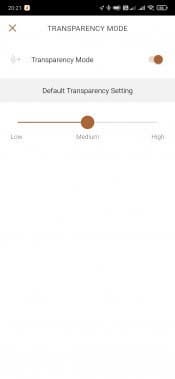 Также из приложения можно включить «звуковую прозрачность» — трансляцию внешних звуков в динамики наушников. Вернее, включать-то ее удобнее с помощью нажатия кнопки на левом наушнике, это позволит быстро ответить на вопрос прохожего, пообщаться с кассиром в магазине или услышать объявление в аэропорту… А вот ради возможности выбрать громкость транслируемого звука уже придется открывать приложение. Такая настройка есть далеко не у всех наушников, иметь ее под рукой оказалось весьма удобно. Из меню слева можно перейти на страницы с информацией об устройстве, на них мы подробно останавливаться не будем.