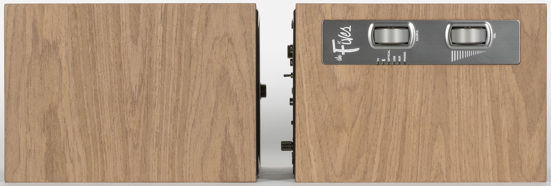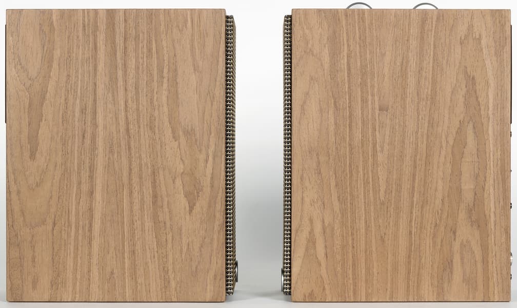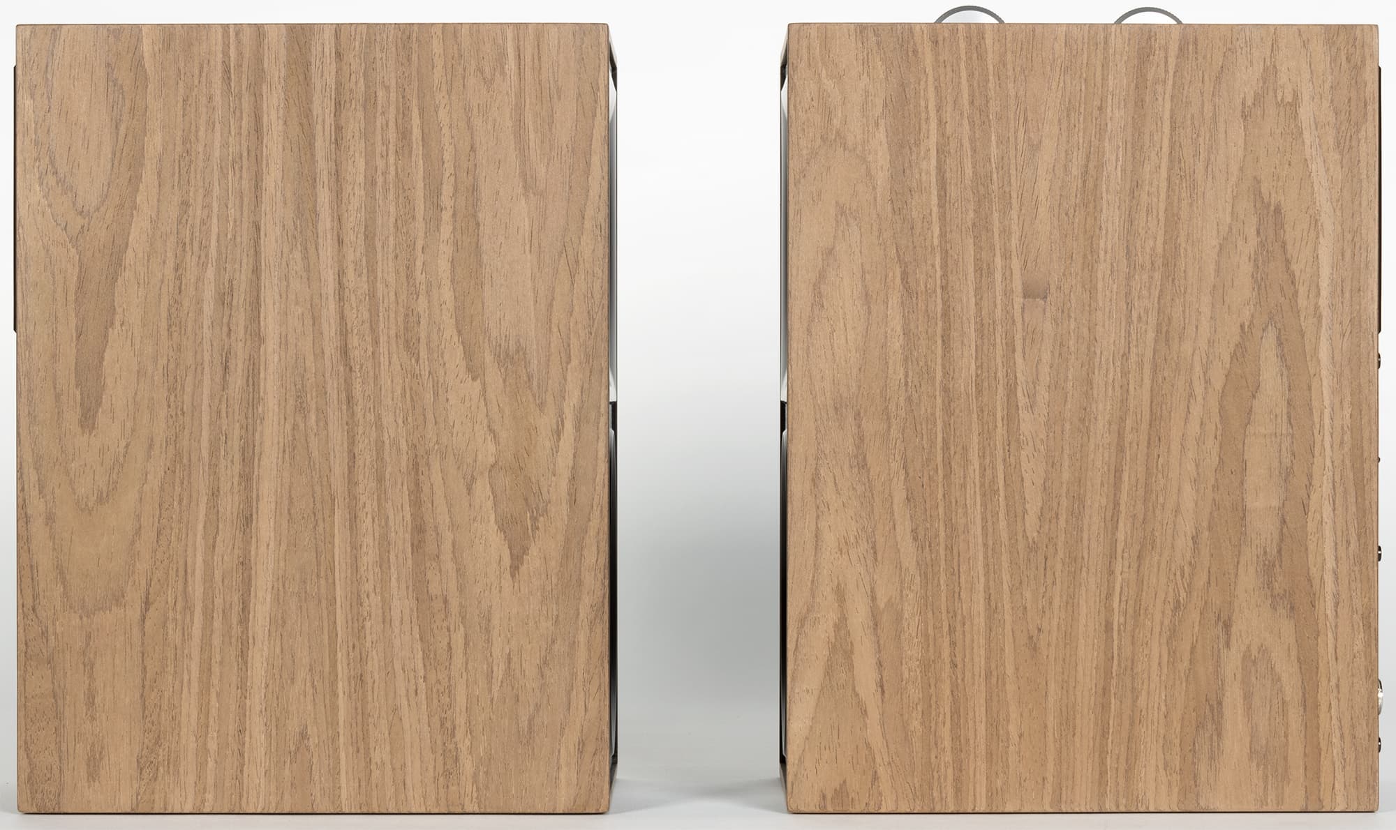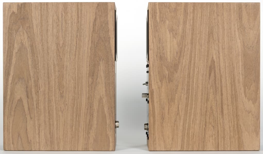 Как уже упоминалось выше, со светлыми грилями колонки выглядят очень приятно, но при этом лаконично — лишнего внимания к себе не привлекают. И вот именно в таком виде дизайн сильнее всего напоминает что-то из середины прошлого века — о том, что на дворе все же XXI век, напоминают лишь ПДУ и ручки управления на верхней панели активной колонки.