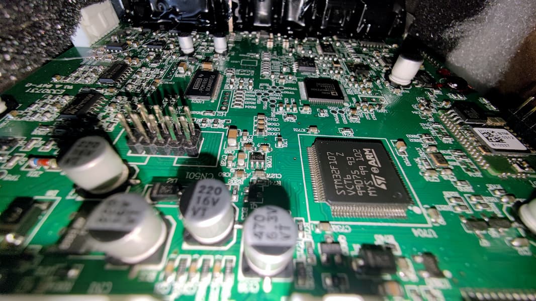 Заглядываем на плату ниже, сразу видим «мозг» всего устройства — микроконтроллер STM32F107VC производства STMicroelectronics.
