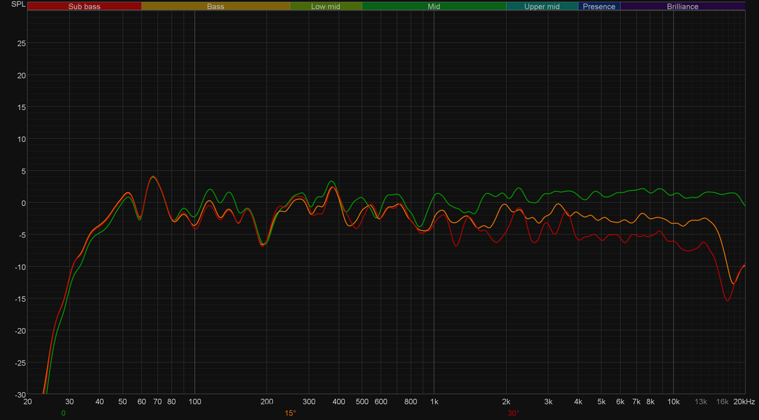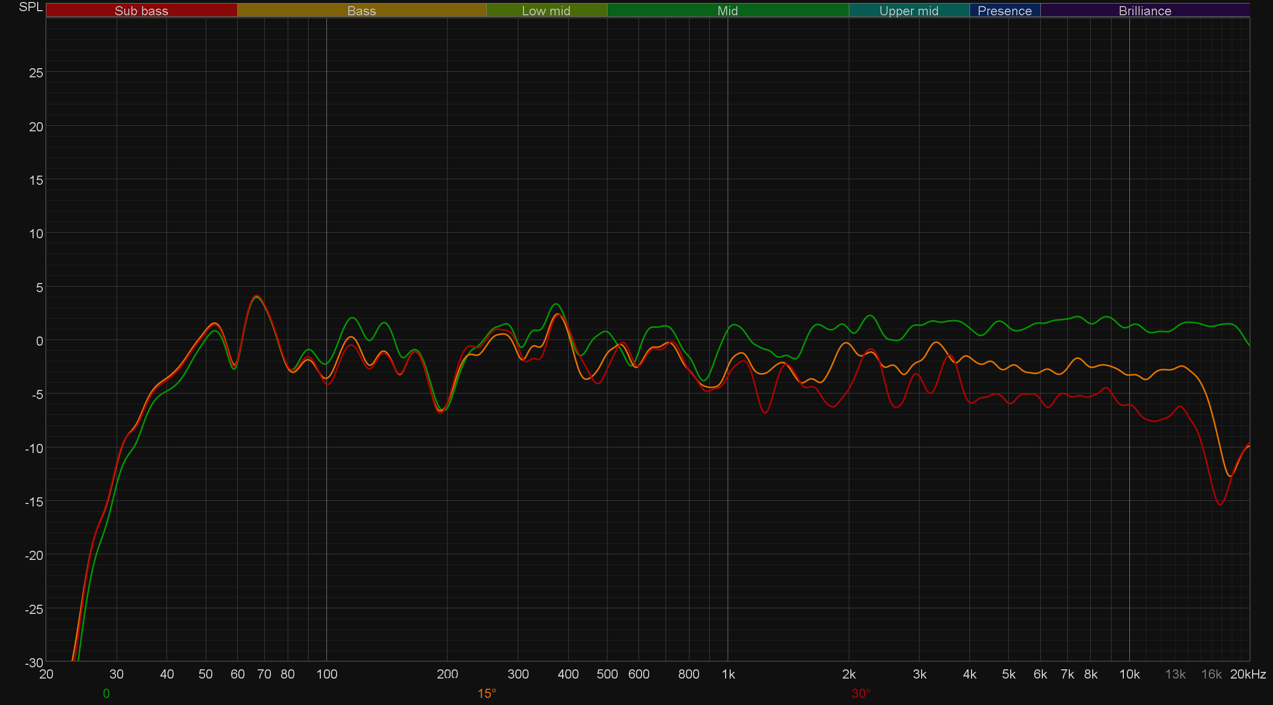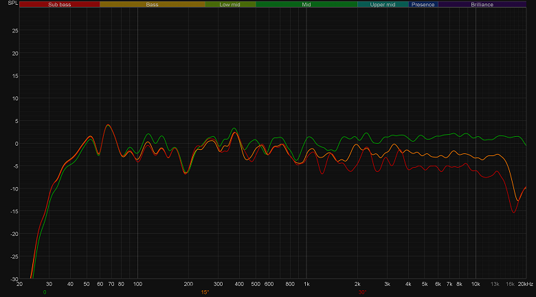 С горизонтальной дисперсией звука все очень неплохо, но все же при повороте колонок примерно на 30° относительно измерительного микрофона заметен основательный «провал» в высоких частотах, так что нелишне будет следить за размещением акустики.