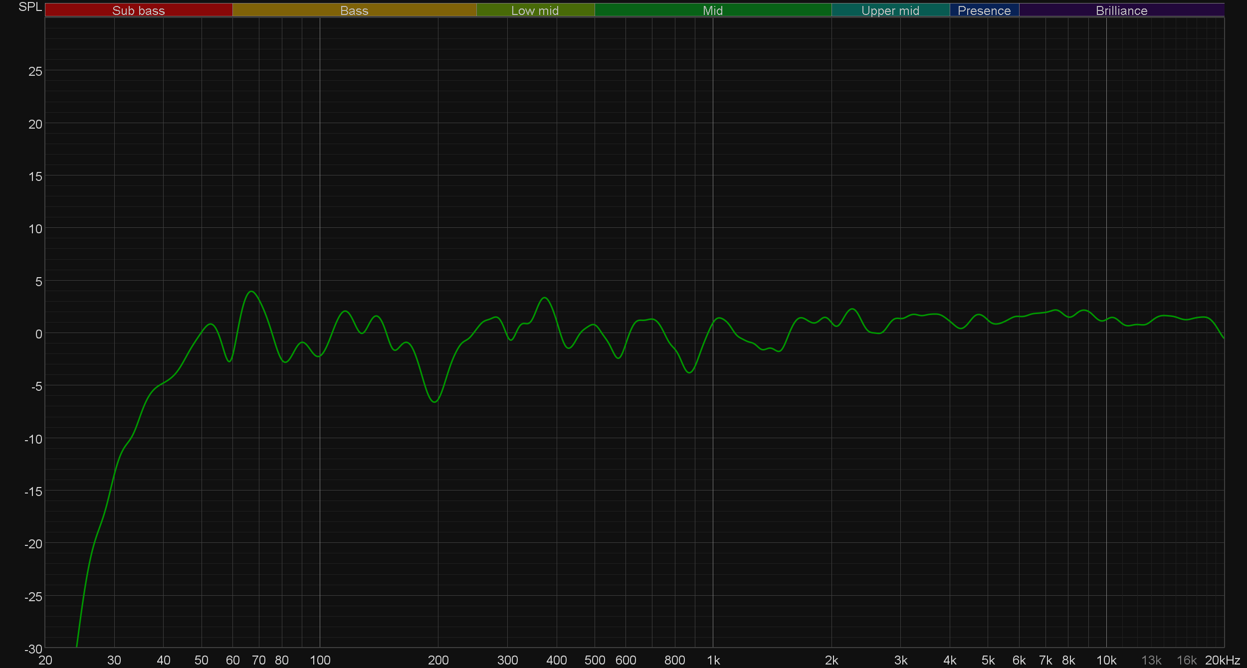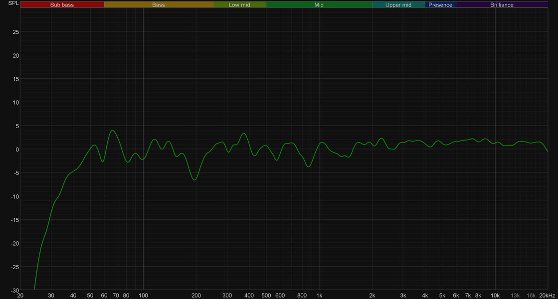Вариантов настройки звука у Klipsch The Fives множество, протестировать все варианты сочетаний будет сложно, потому слушали мы ее с отключенным Dynamic Bass EQ, без задействования эквалайзера и подключения сабвуфера. И получили массу удовольствия. Акустика прекрасно справляется с большей частью НЧ-диапазона, дает отлично читаемую и «ровную» середину, не раздражает ухо распространенными дефектами верхних частот... При этом обладает своим характером: создается впечатление, что к «ровному и мониторному» звуку добавили пару интересных акцентов, сделав звучание более эффектным. График АЧХ это прекрасно подтверждает. Получен он был традиционным для наших тестирований способом: при размещении измерительного микрофона примерно в 60 см от устройства на оси высокочастотного динамика.