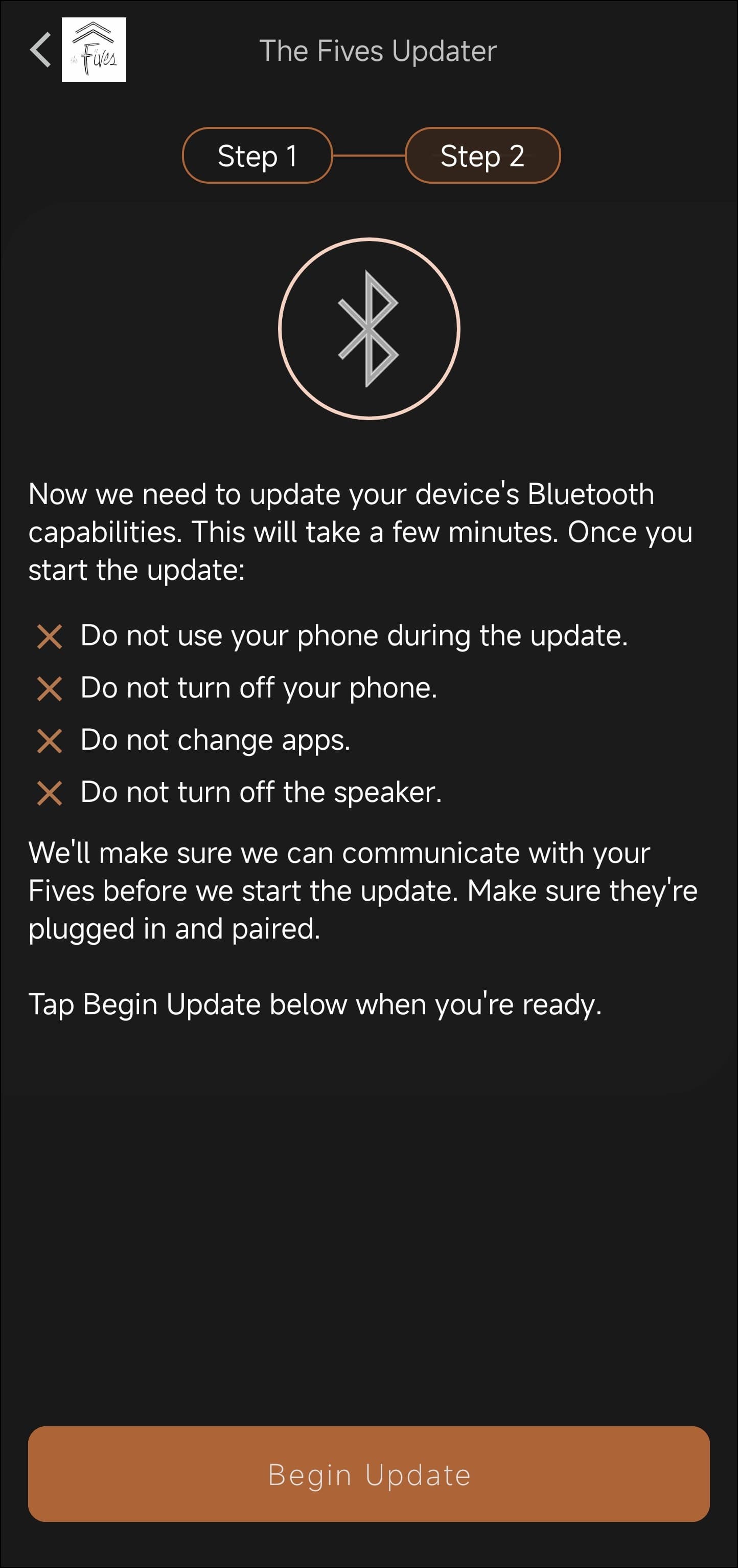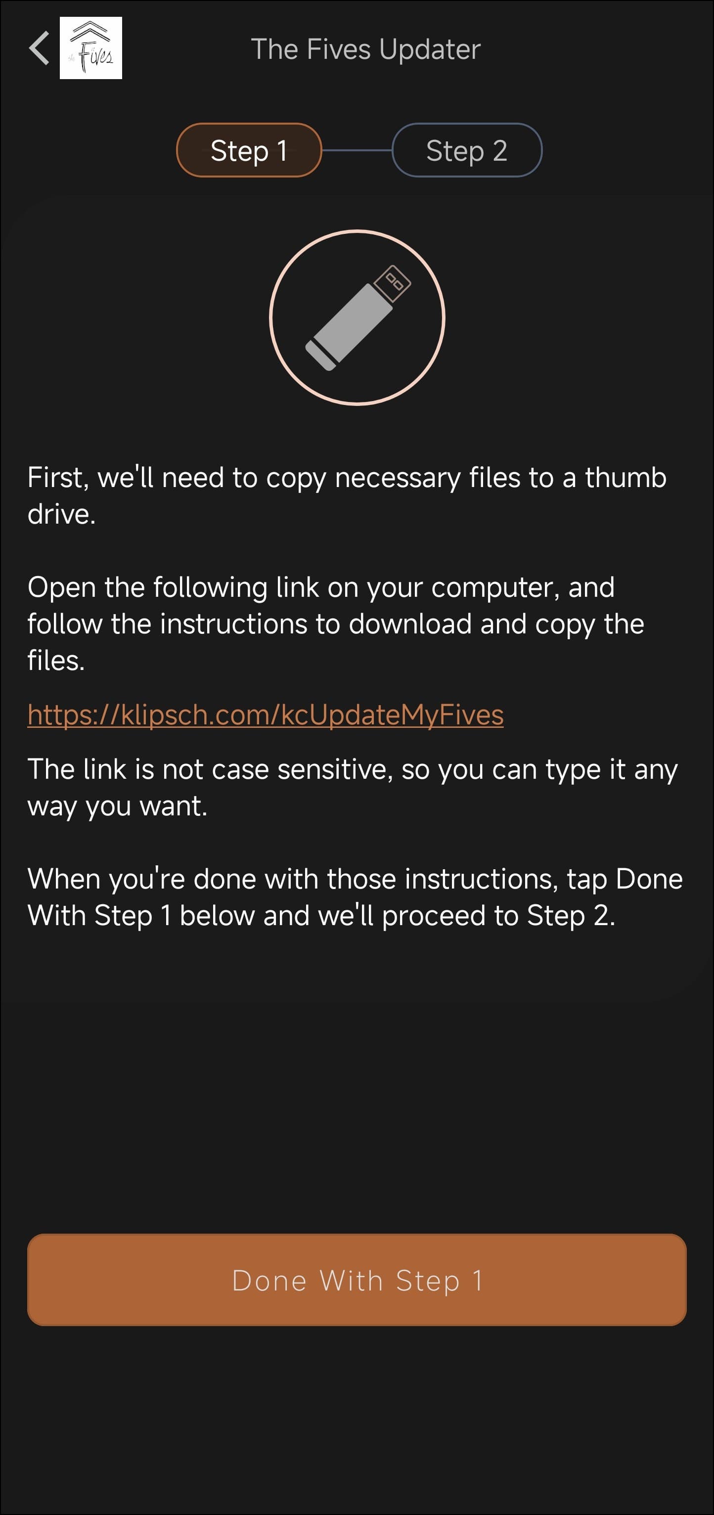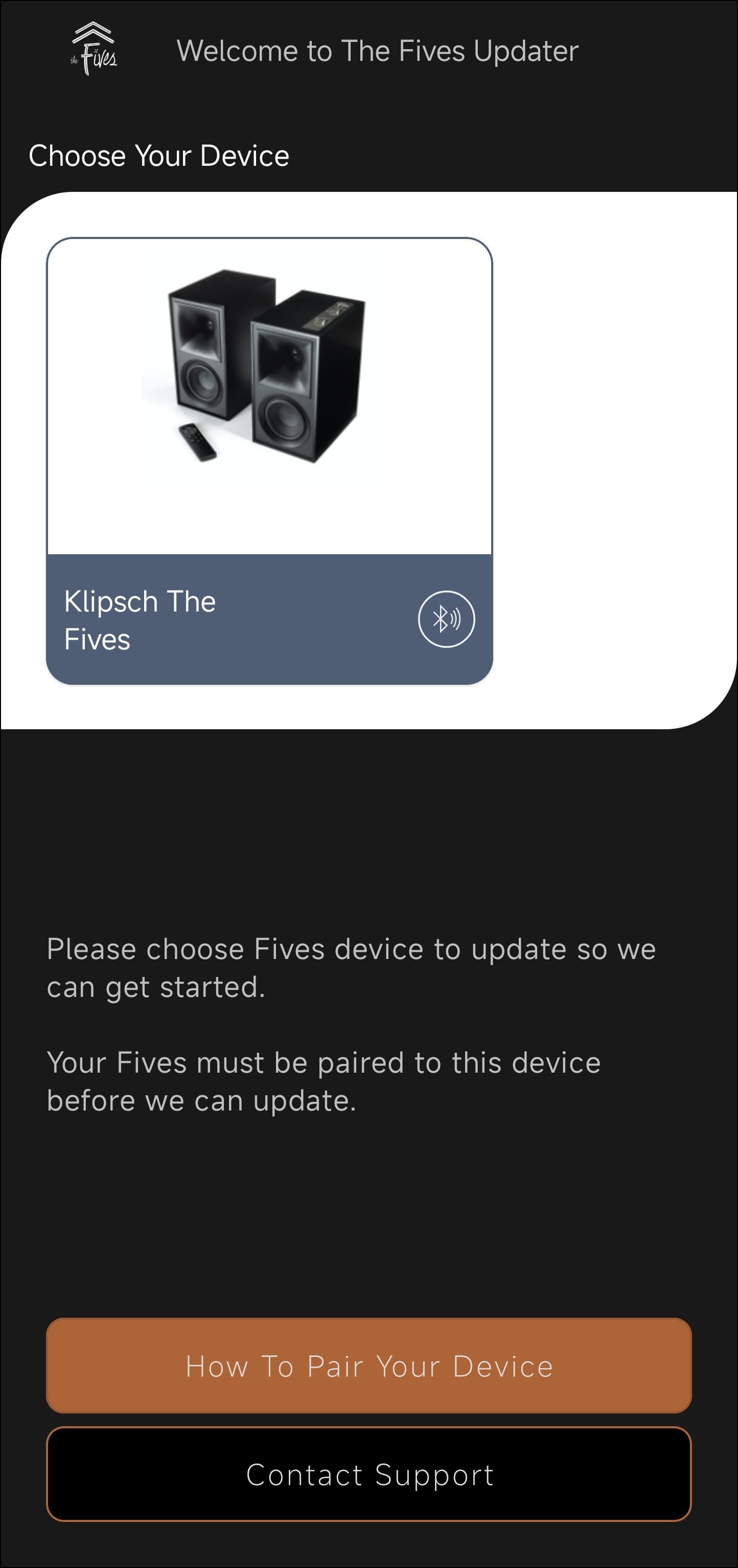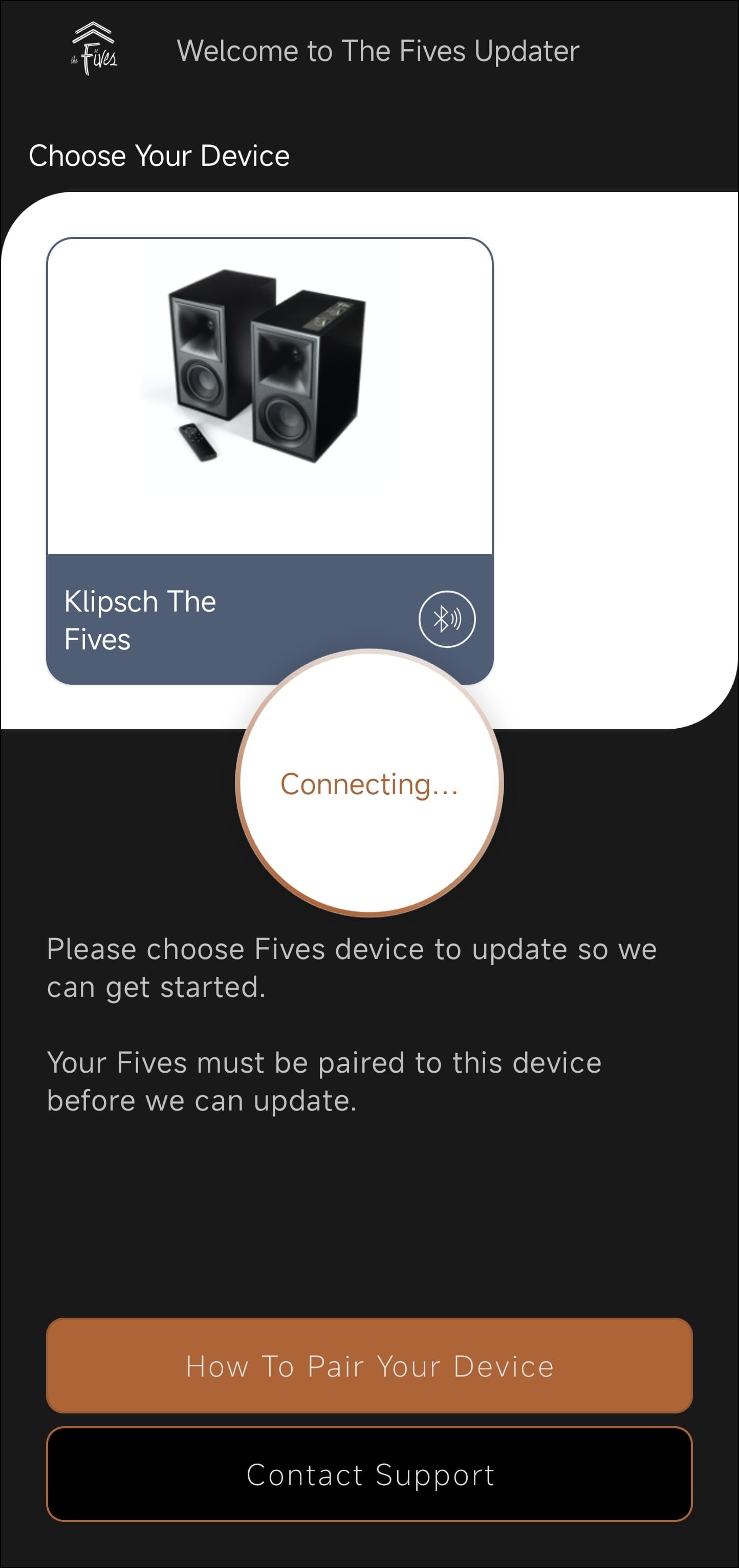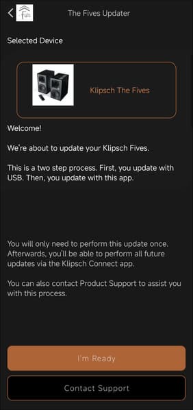 Для начала скачиваем приложение Klipsch The Fives Updater и устанавливаем его. Выбираем наши колонки, наблюдаем за процессом подключения. Далее приложение предлагает нам для начала установить обновления с помощью сервисного порта USB, который мы видели выше.