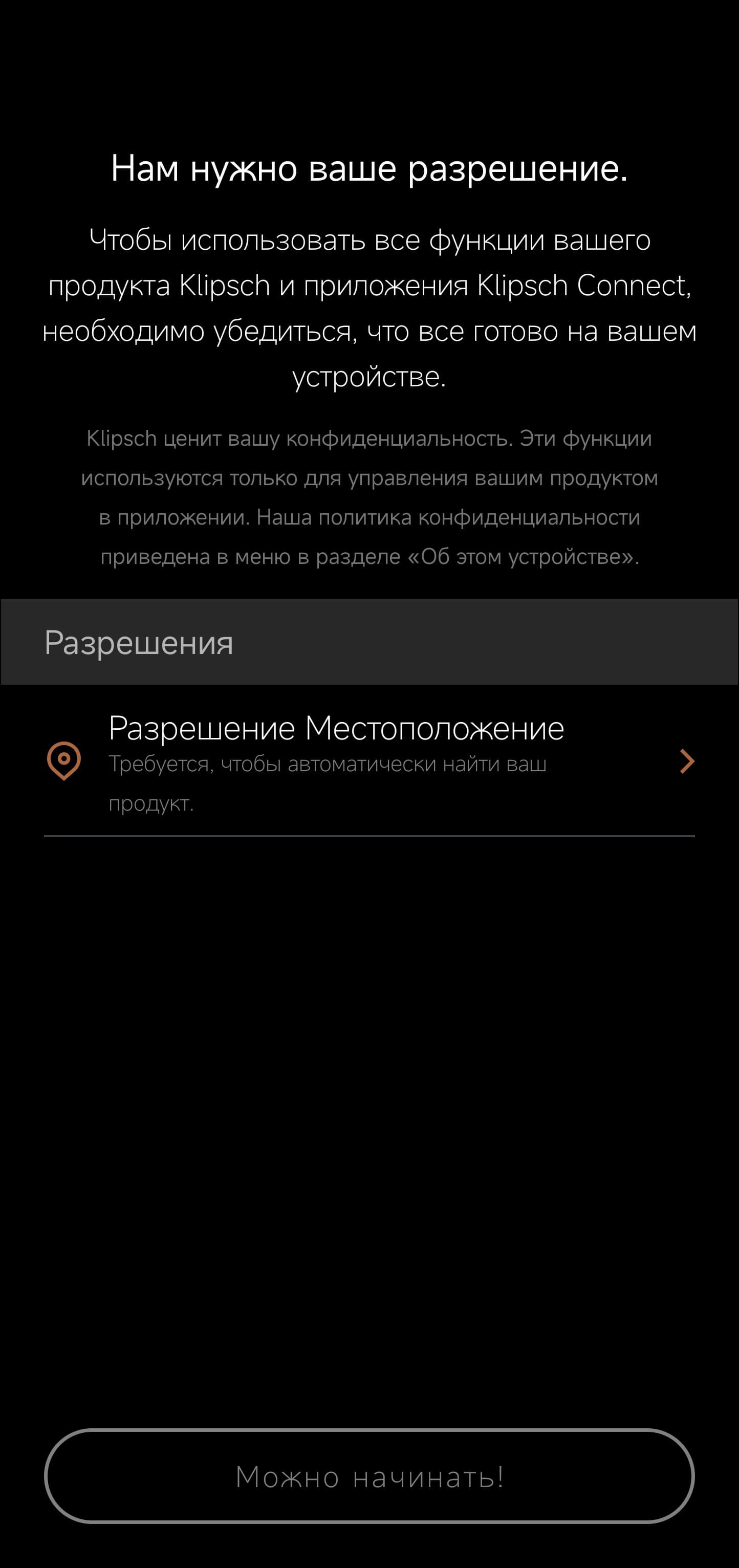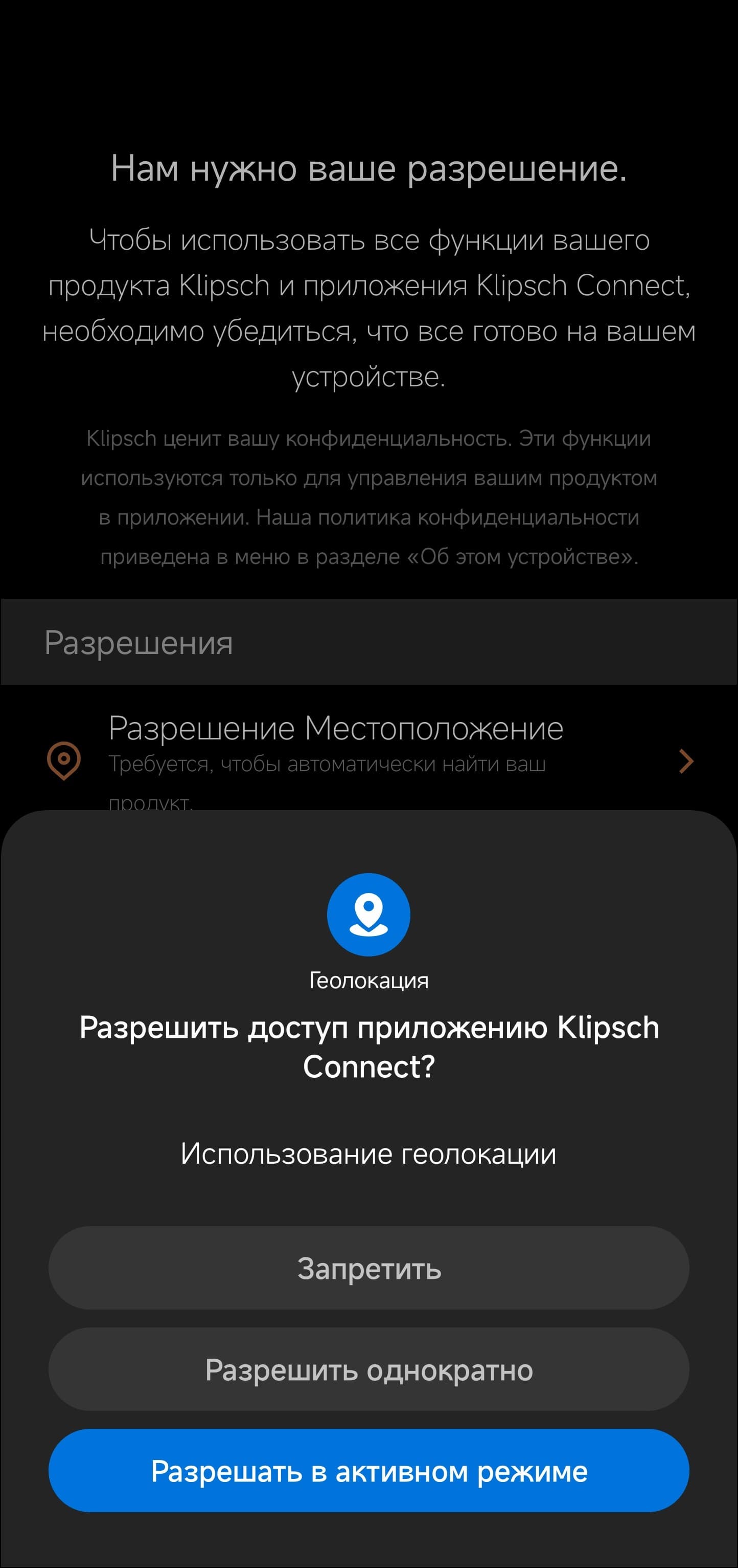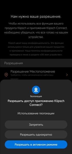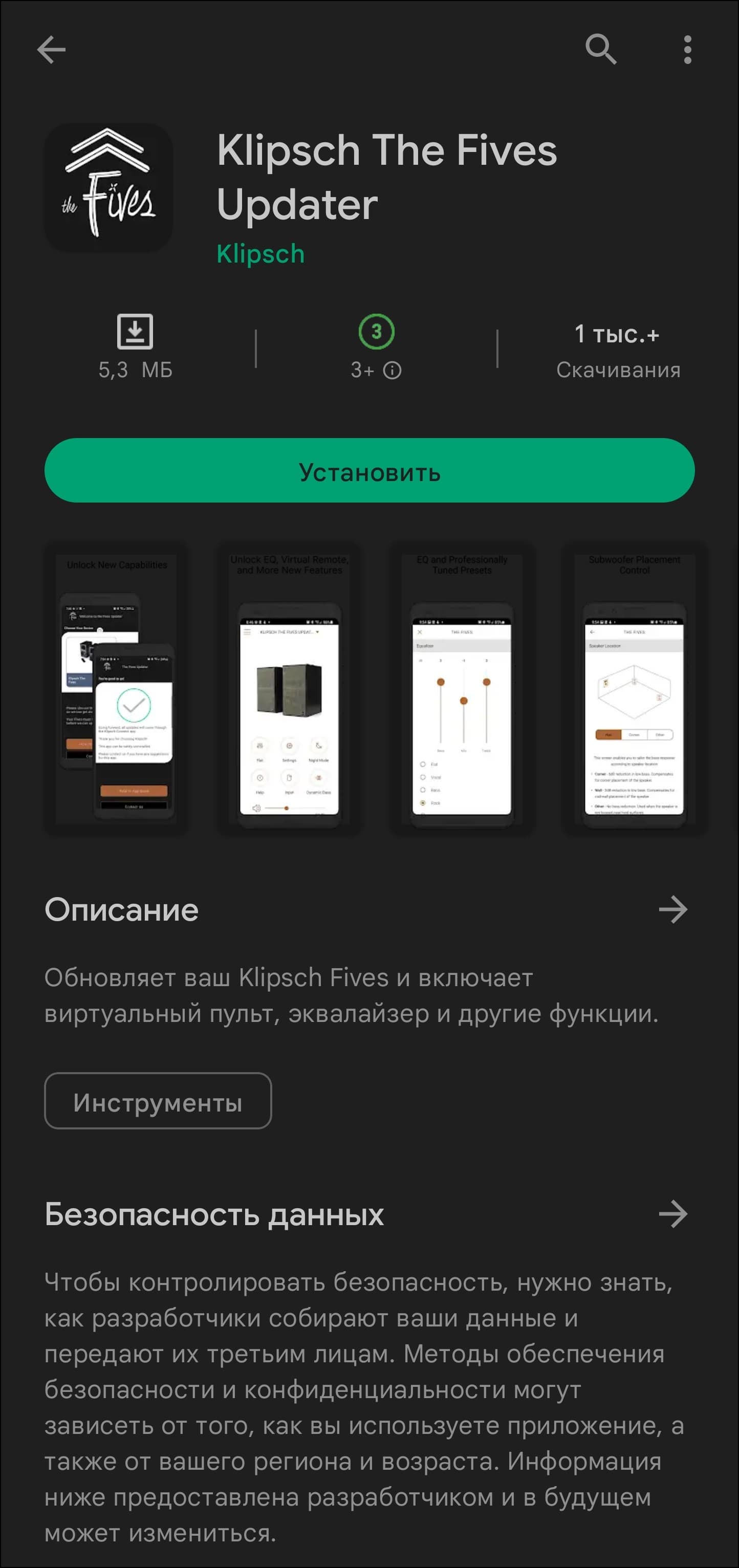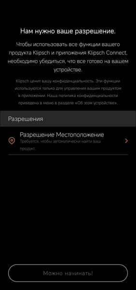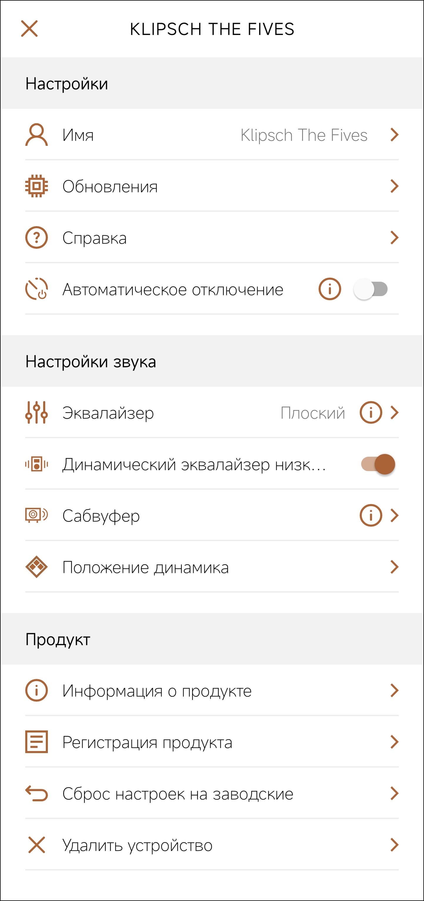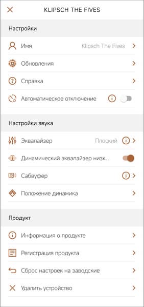 Далее управление и обновление прошивки Klipsch The Fives может осуществляться с помощью ПО Klipsch Connect, о котором мы уже как-то говорили. Устанавливаем, даем необходимые разрешения. Сразу отметим, что работает ПО только тогда, когда колонки подключены посредством Bluetooth, плюс на момент тестирования делало оно это не очень стабильно — периодически «отваливалось» и не сохраняло настройки. Уверены, что со временем все будет исправлено, но пока сильно рассчитывать на него не приходится. Благо, что и особой необходимости в этом нет, акустика явно больше рассчитана на проводное подключение, а других возможностей управления достаточно для комфортного использования.