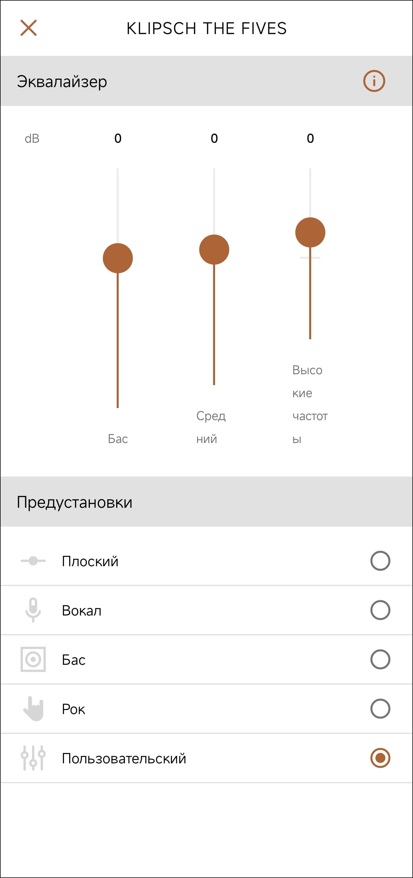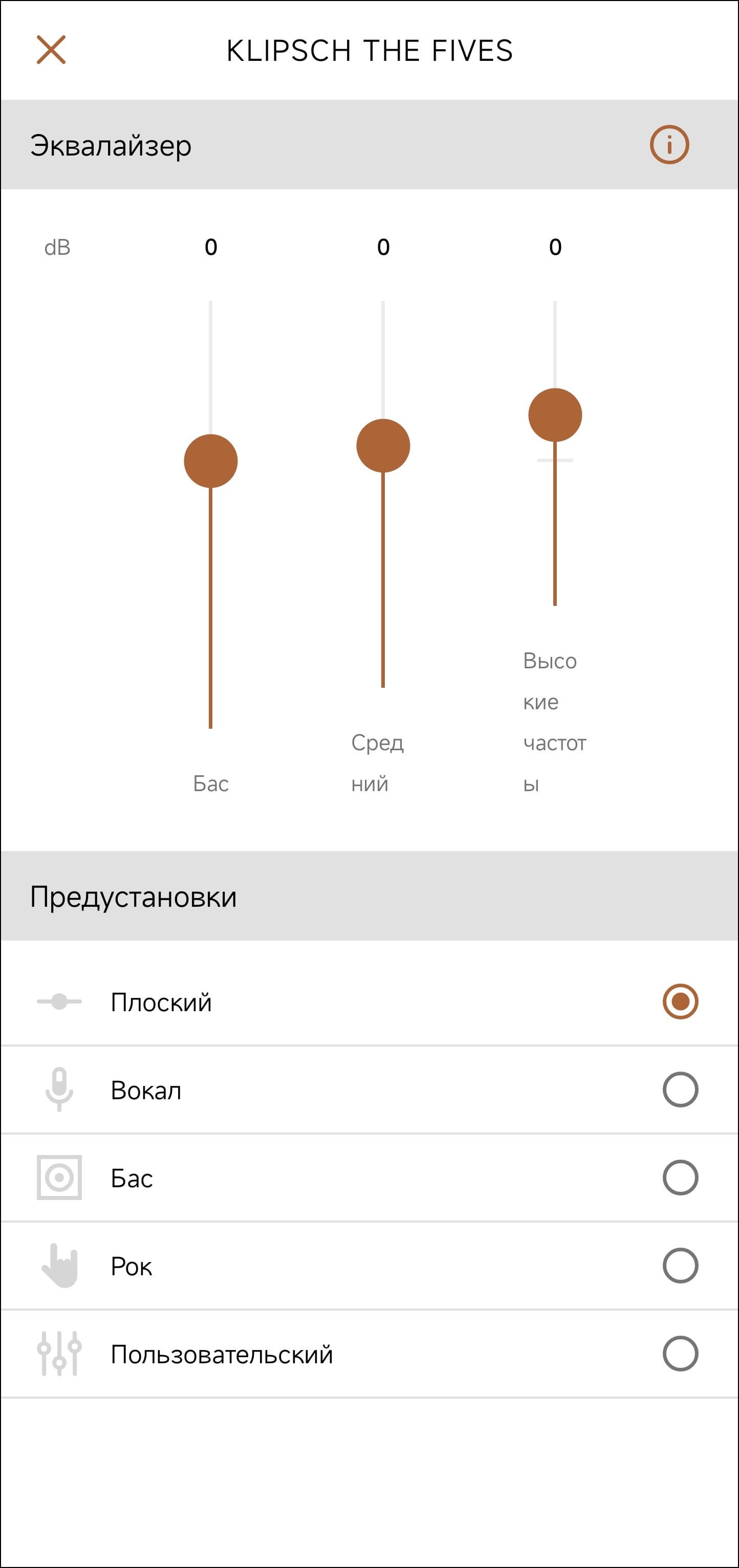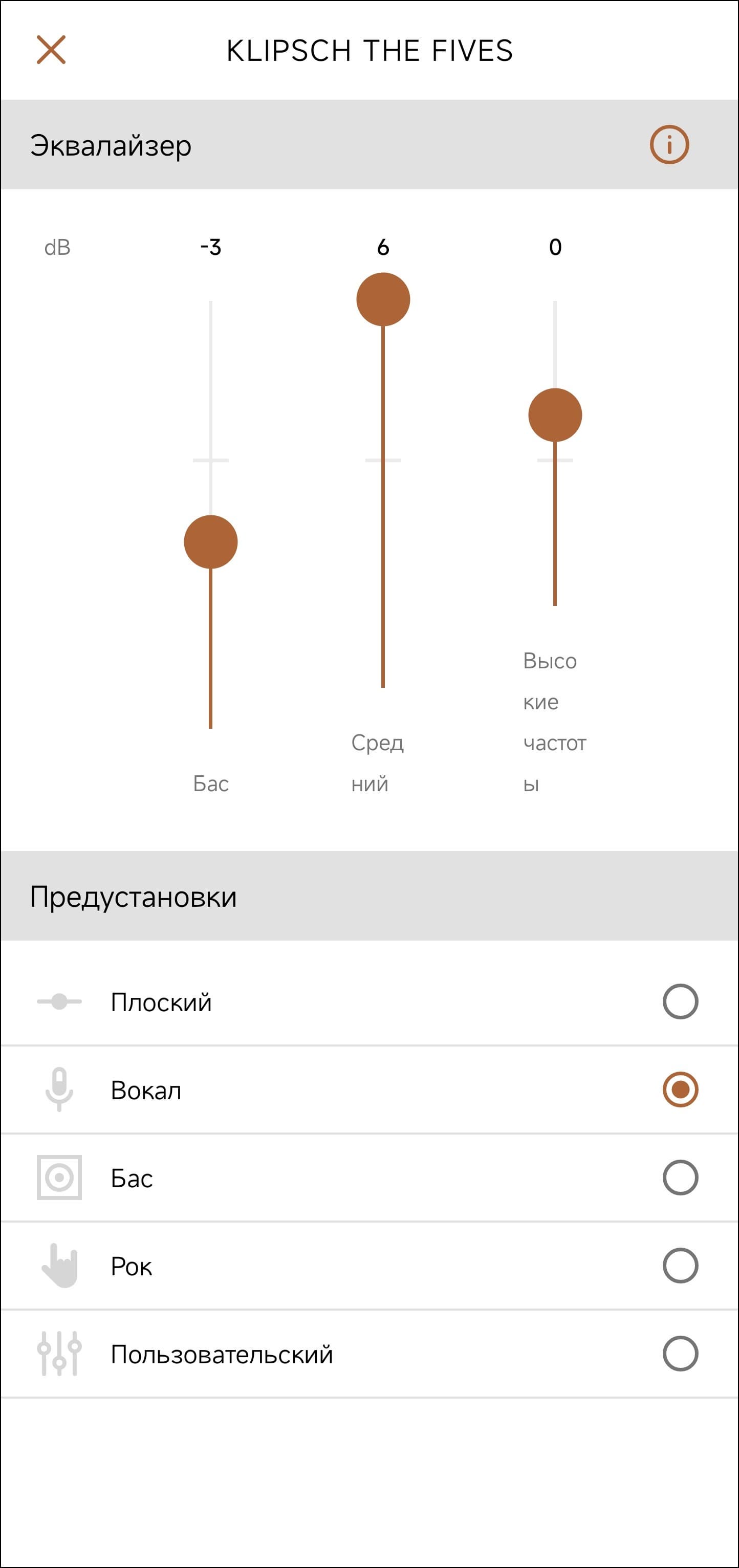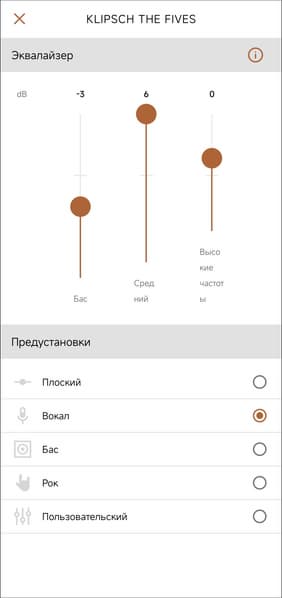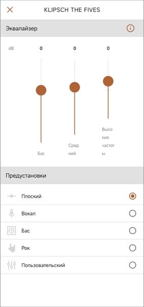 С помощью кнопки на главном экране сразу перейдем на вкладку эквалайзера. Есть несколько пресетов, а также возможность создавать свои. Правда полосы всего три, но чуть подстроить звучание под себя они все же позволяют.