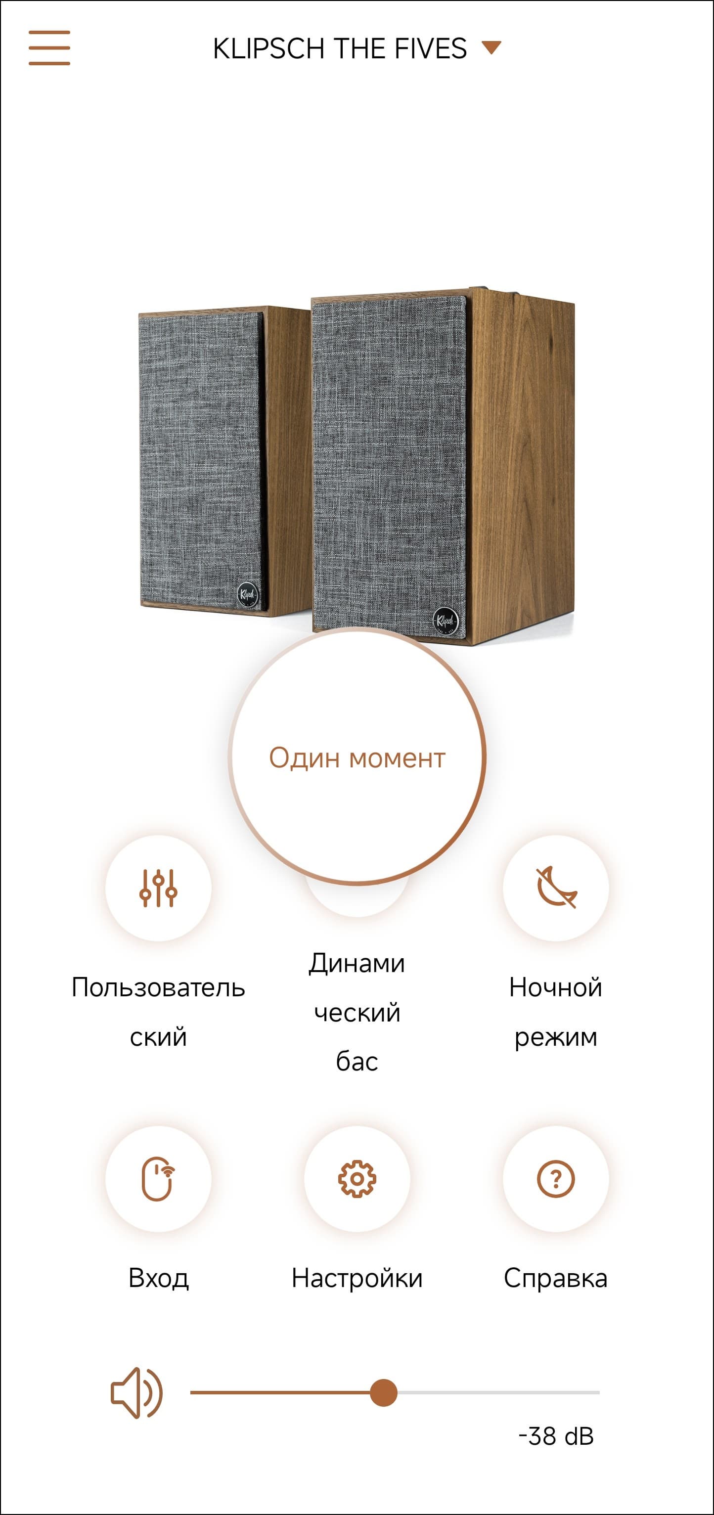 Также с главного экрана можно включить и выключить функцию динамического баса и ночной режим, выбрать активный вход и так далее. К сожалению, часто переключение занимает довольно ощутимое время, в течение которого приходится наблюдать иконку с надписью «Один момент».