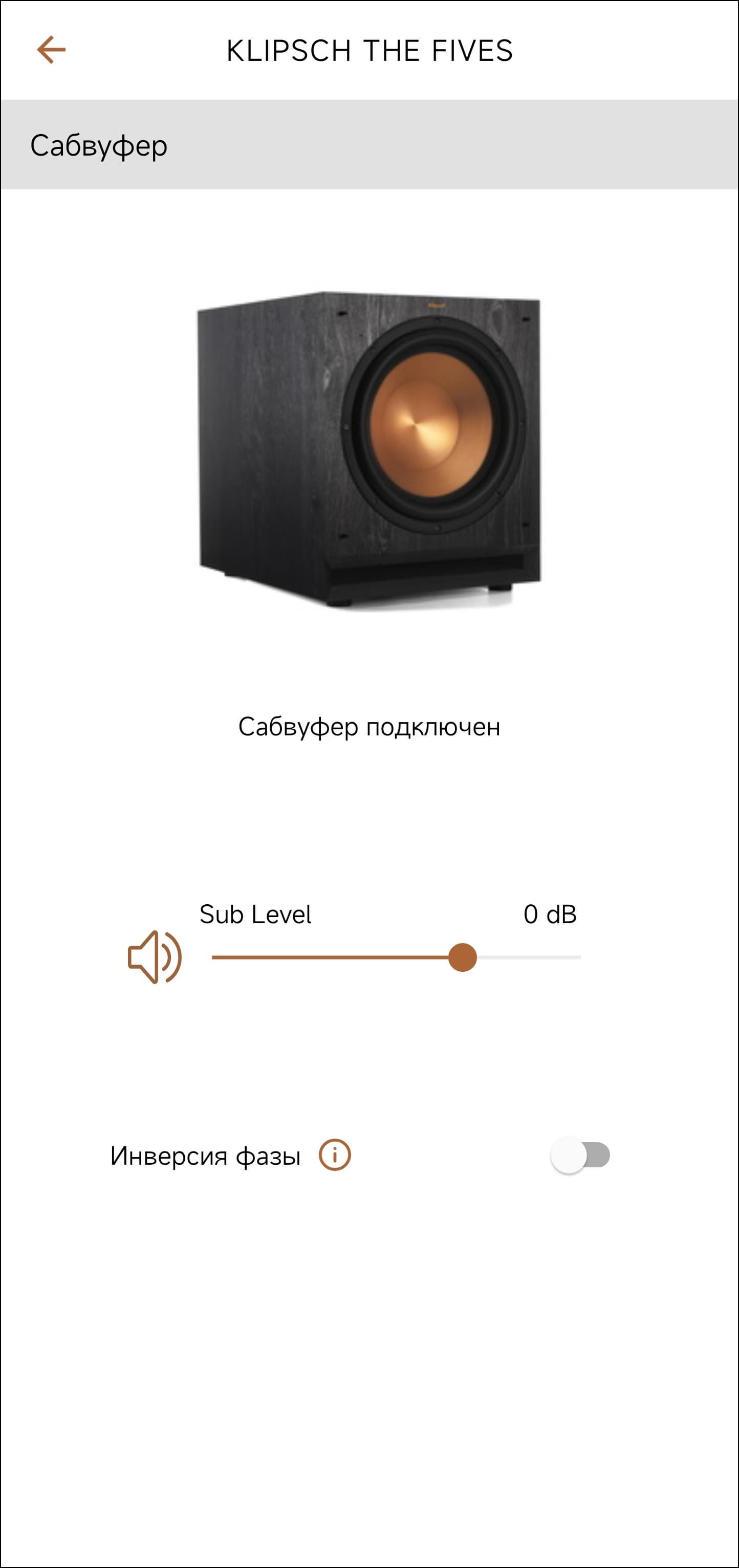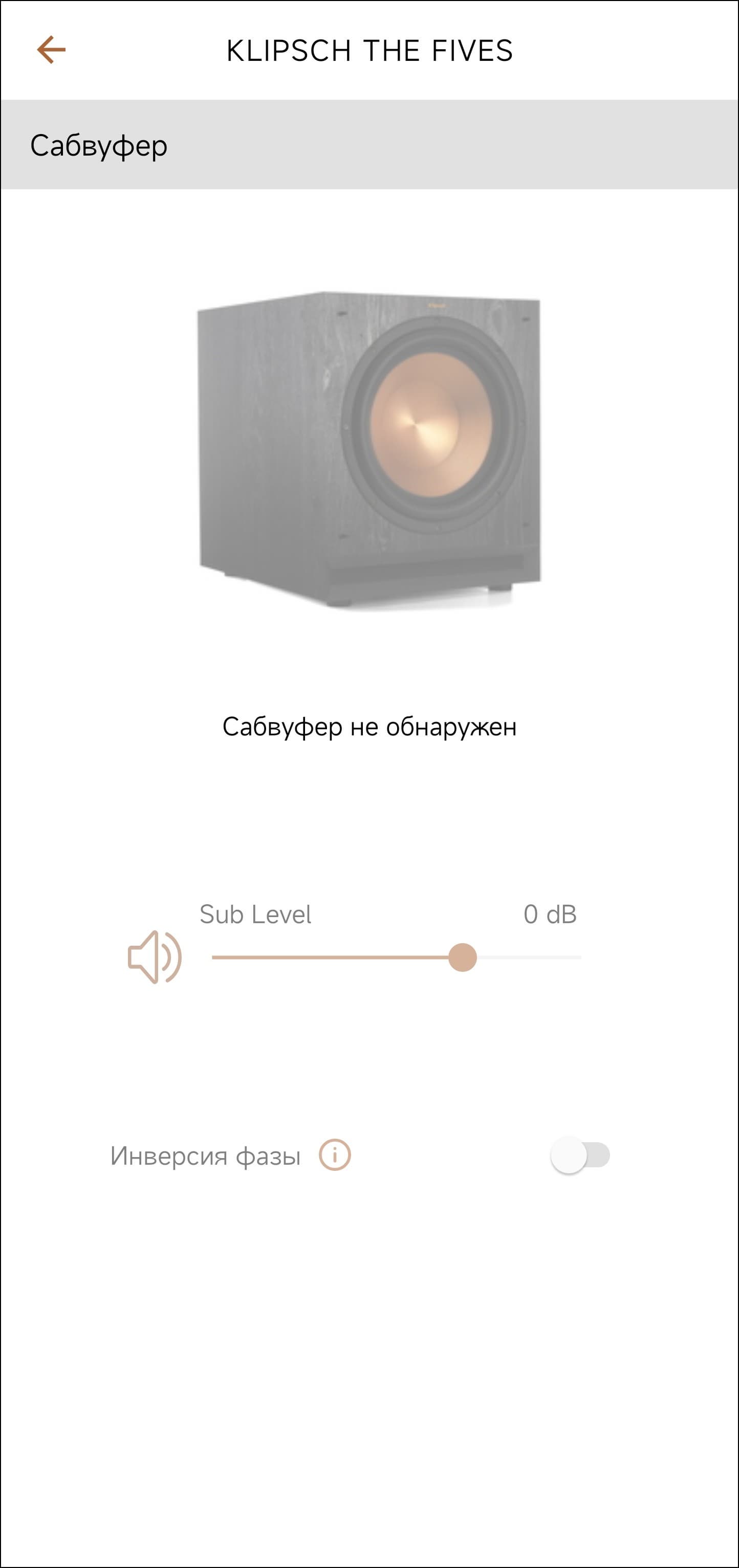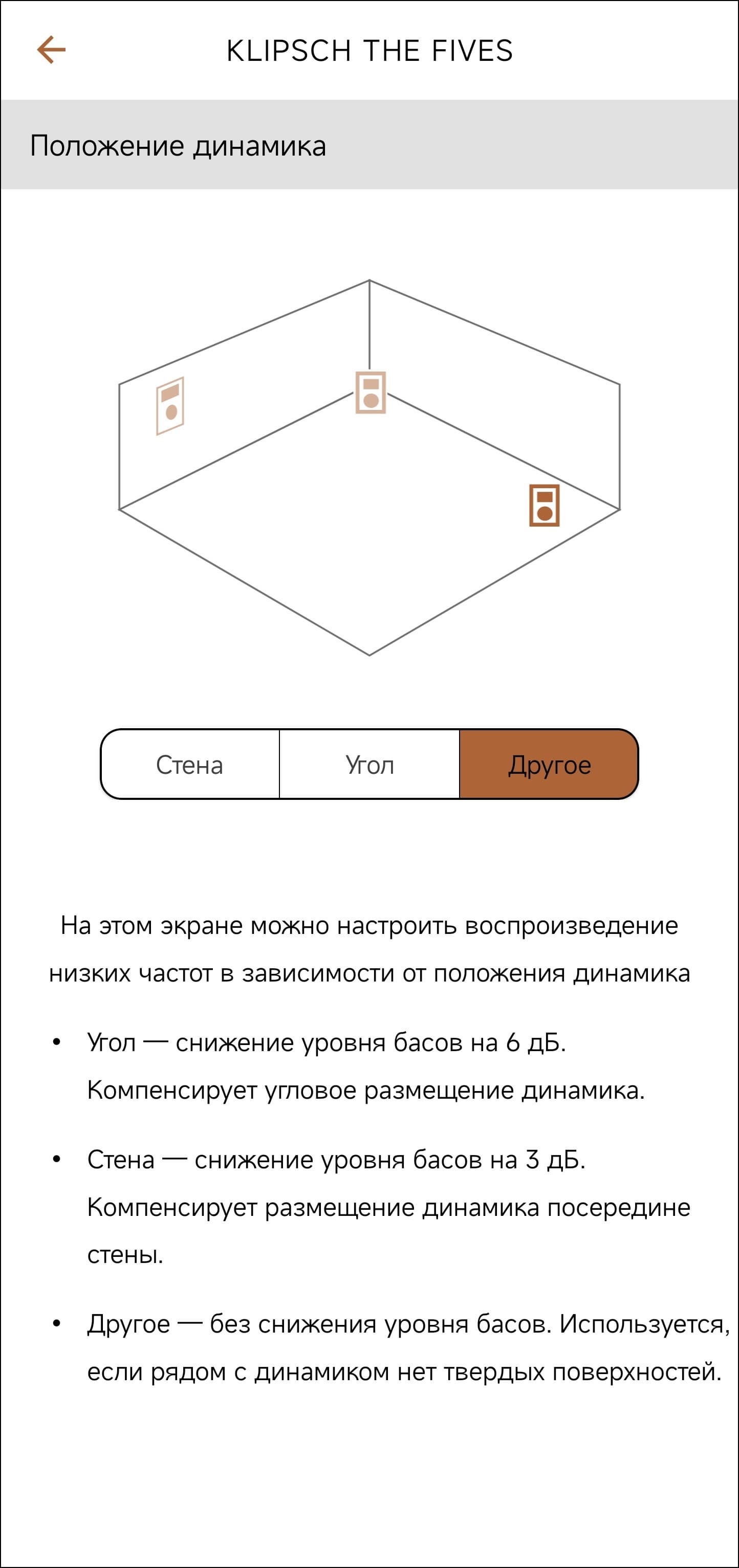 Также из приложения можно регулировать громкость сабвуфера, если он подключен — в противном случае настройка неактивна. Крайне полезная функция — изменение уровня баса в зависимости от размещения колонок: возле стены, в углу или на открытом пространстве.