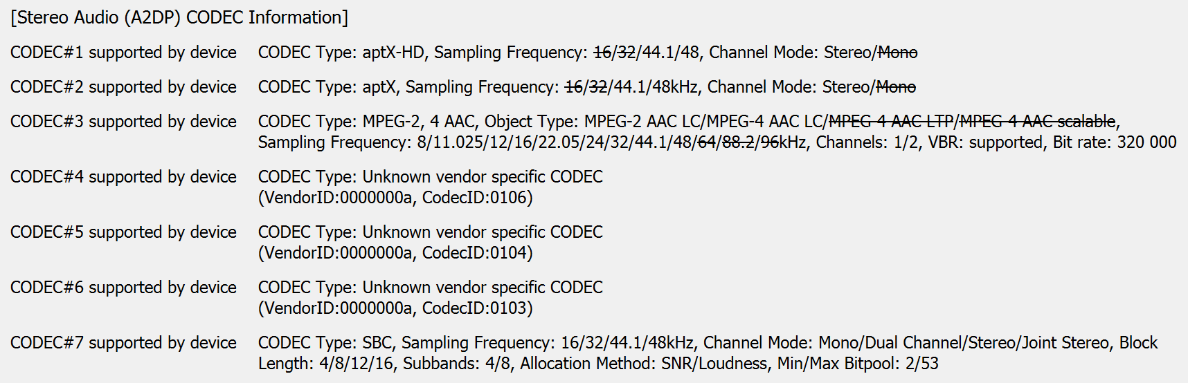 Мультипойнт не поддерживается, полный список доступных кодеков и их режимов мы традиционно получили с помощью утилиты Bluetooth Tweaker.