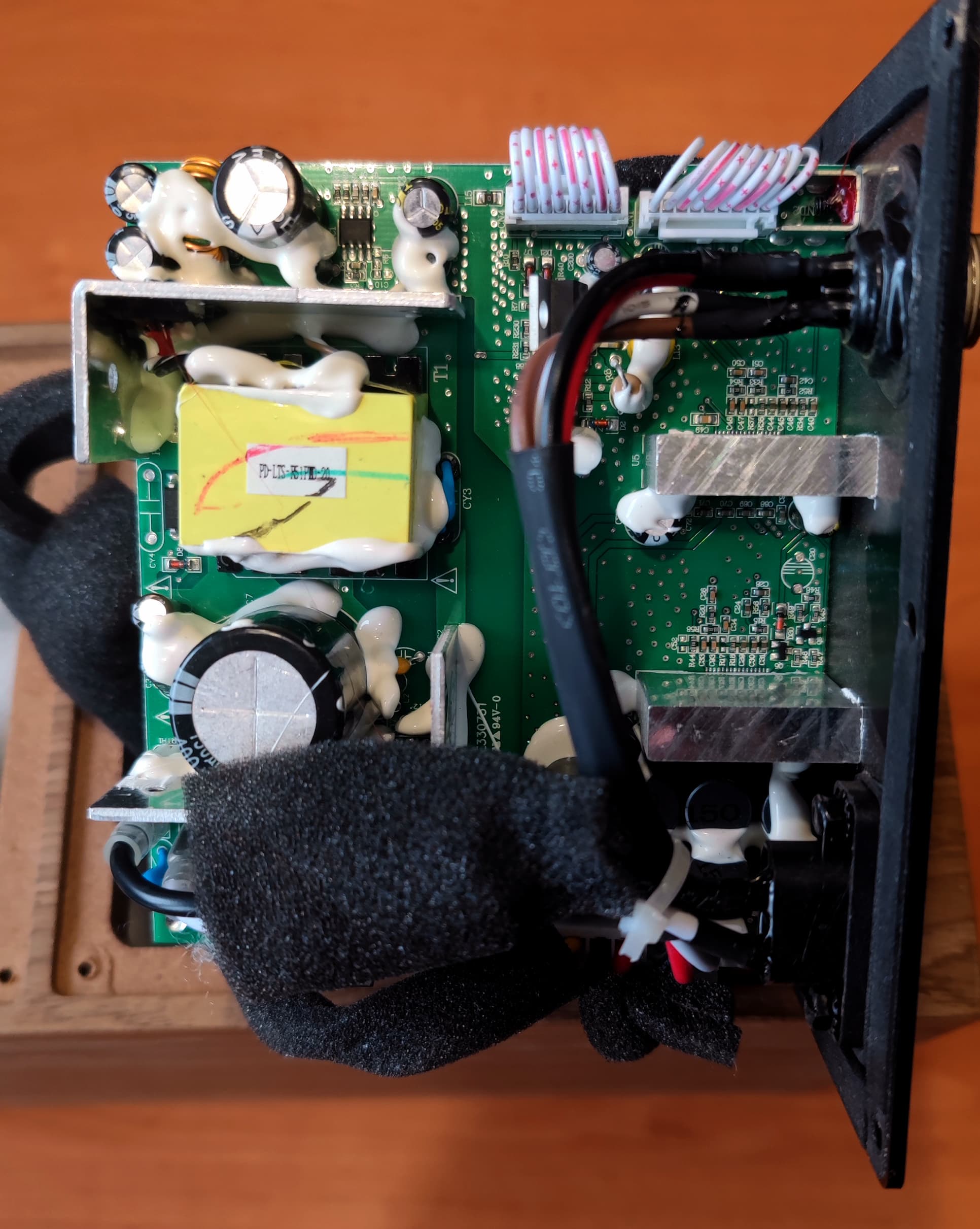 На оставшейся плате расположены блок питания и усилитель. Микросхемы усилителя оборудованы радиаторами, снять которые, не повредив конструкцию, крайне сложно — оставим их на месте. Из описания колонок мы знаем, что усилительная часть построена по схеме bi-amping, модуль для высокочастотной секции имеет мощность 20 ватт, НЧ-регистр озвучивается 60-ваттным усилителем. Суммарная мощность всех усилителей D-класса с низким уровнем шума составляет 160 Вт (до 320 Вт) в пике.