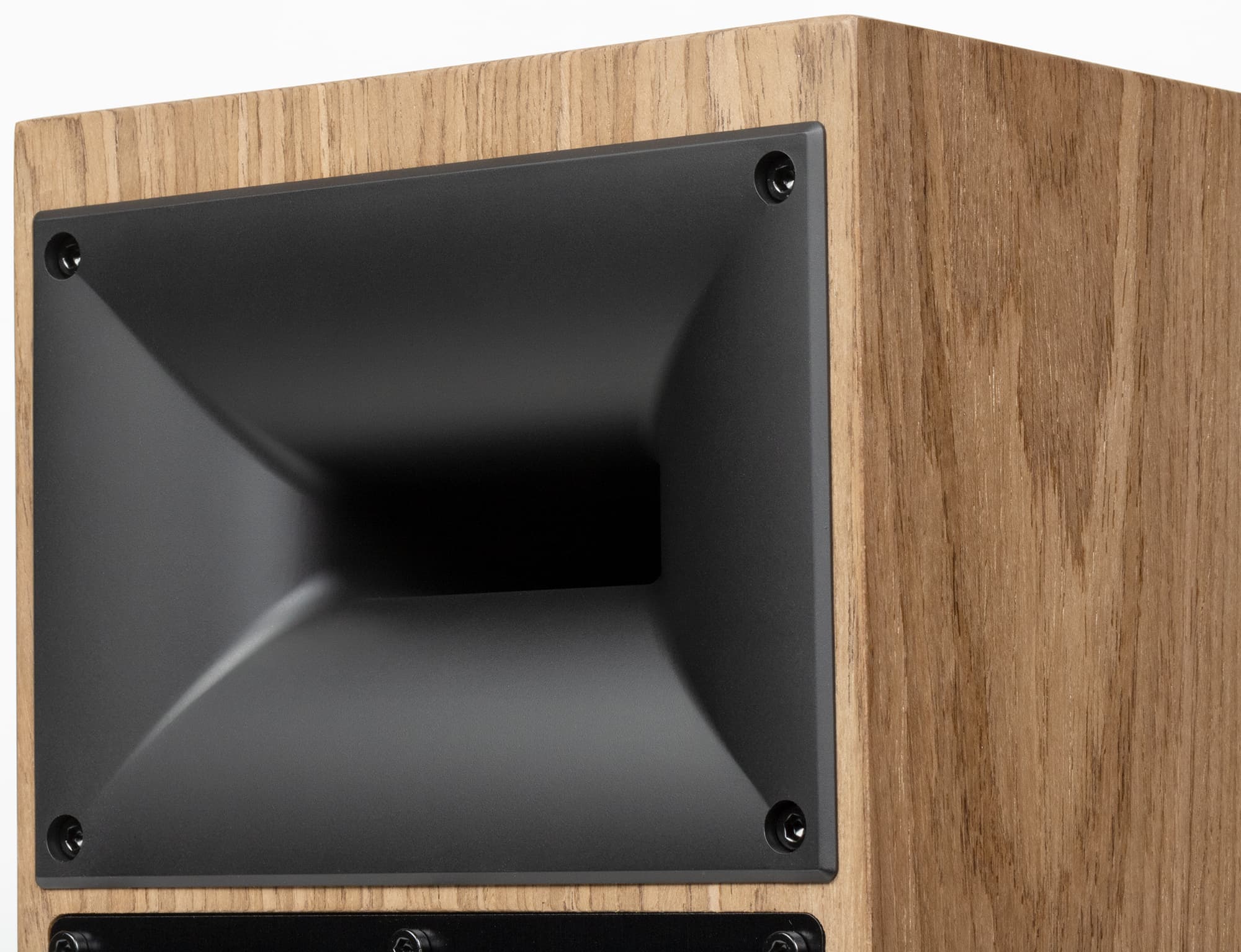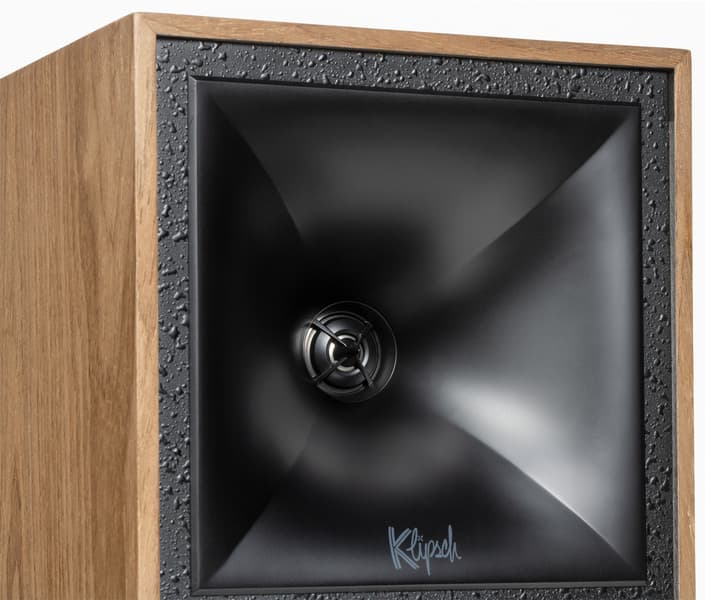 Сверху размещен рупорный твитер LTS (Linear Travel Suspension) с 25-миллиметровой титановой диафрагмой. Рупор же — вообще отдельная история, его форму инженеры Klipsch совершенствуют очень давно и успешно. Устье рупора раскрывается по трактрисе, отсюда и название — Tractrix. По замыслу авторов, это позволяет звуку быть направленным точно на слушателя, что помогает избежать лишних отражений внутри помещения.