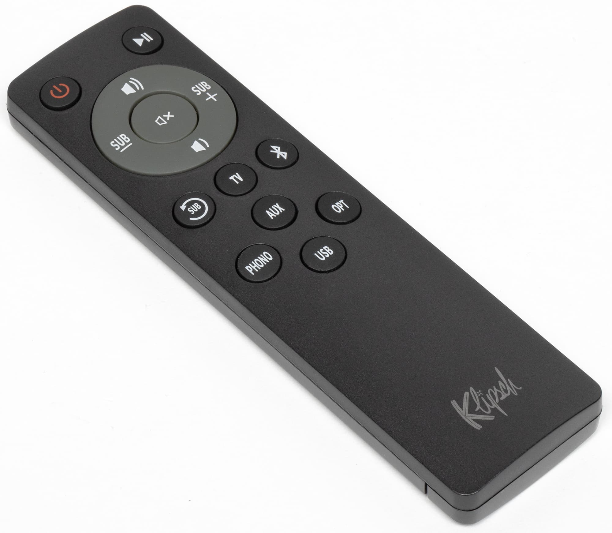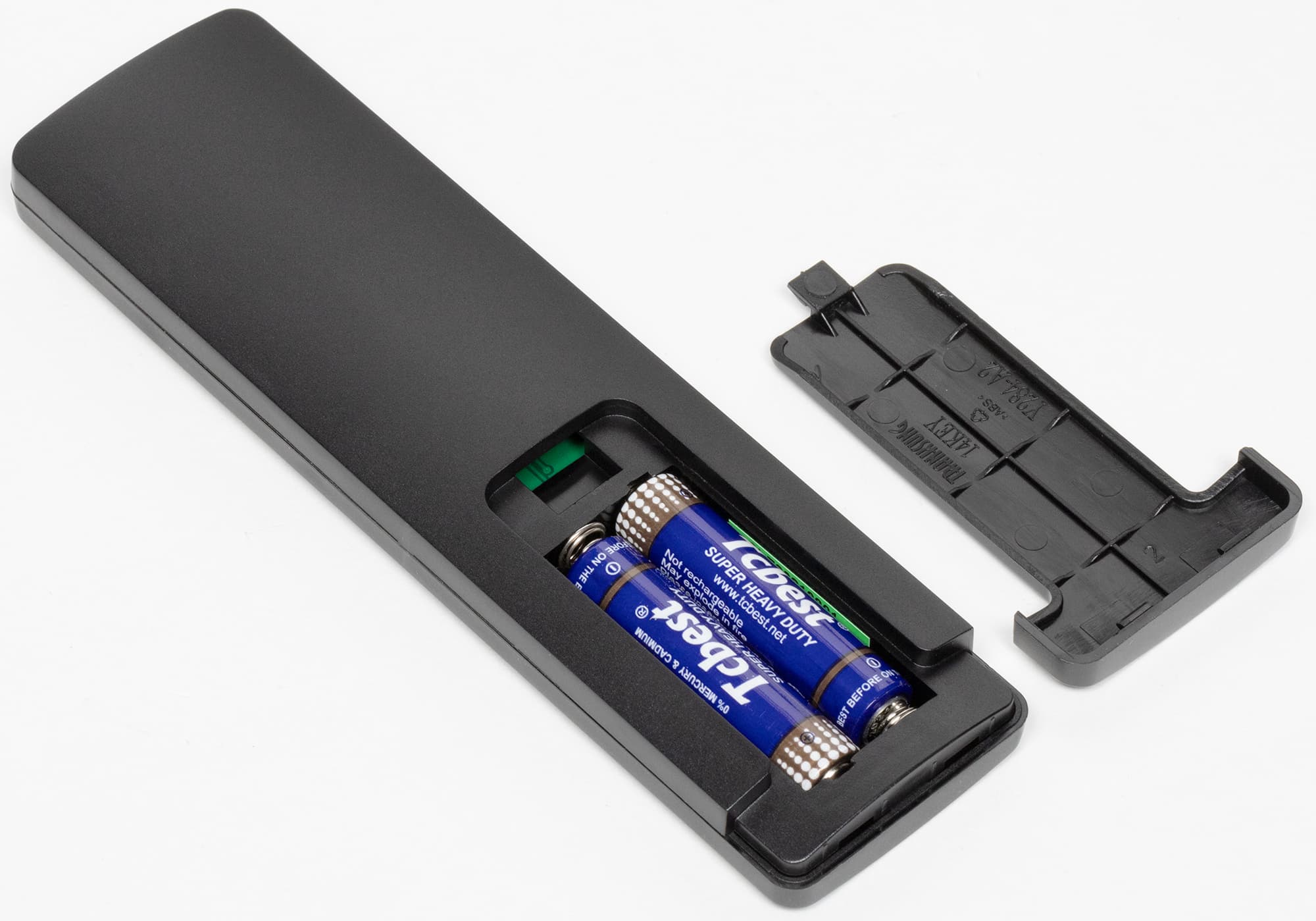 Пульт дистанционного управления выполнен из матового пластика, устойчивого к появлению загрязнений. Питание осуществляется от двух элементов ААА, идущих в комплекте. Кнопки нажимаются с легко и с приятным кликом, управление громкостью самой акустики и подключенного сабвуфера вынесено на отдельное «колесо», которое удобно находить на ощупь. Возможность управлять громкостью сабвуфера с пульта порадовала отдельно — можно изменять акцент на басе, не вставая с дивана.