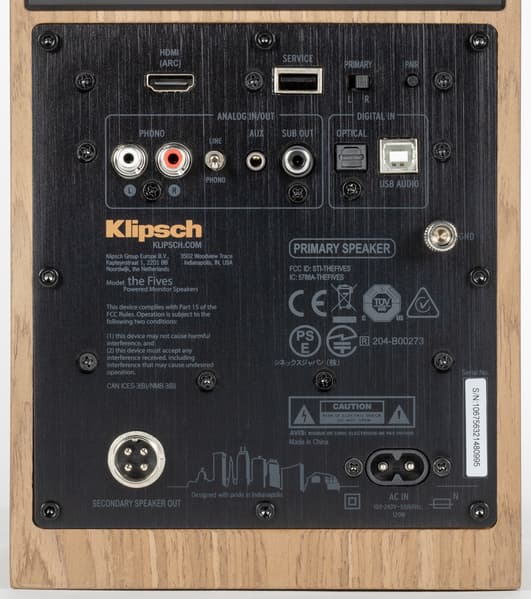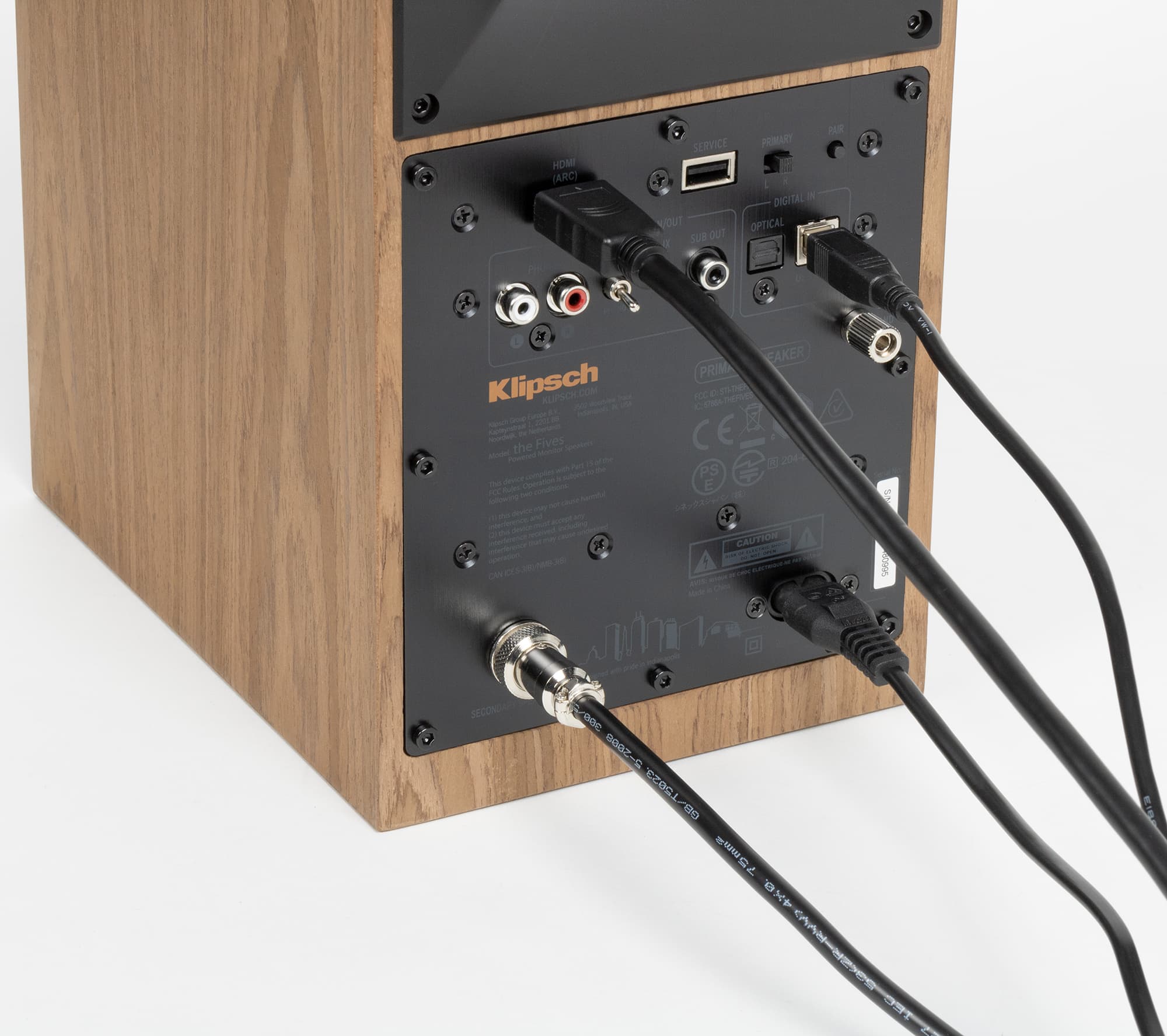 Порты фазоинверторов Klipsch The Fives выведены назад, а потому размещать их лучше на расстоянии от стен: пары десятков сантиметров будет достаточно, но тут всегда есть пространство для экспериментов. Особенно если учесть наличие у акустики функции Dynamic Bass EQ, позволяющей динамически изменять акцент на НЧ-регистре в зависимости от громкости. Что же касается подключения источников, то тут все очень интересно и разнообразно.