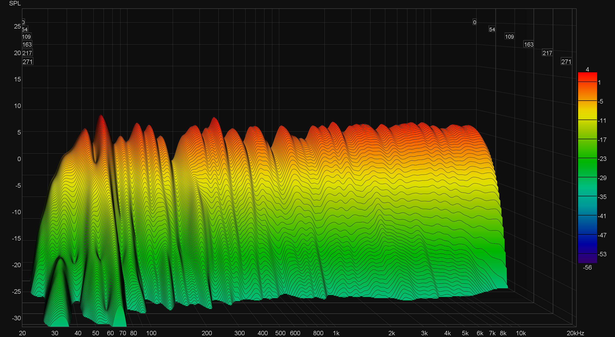 Но и без сабвуфера умение акустики воспроизводить низкочастотный диапазон внушает уважение. Бас при этом не слишком гулкий и не «бубнит». Подается он вполне четко и с хорошей атакой, что видно на графике кумулятивного затухания спектра (он же «водопад» или waterfall).