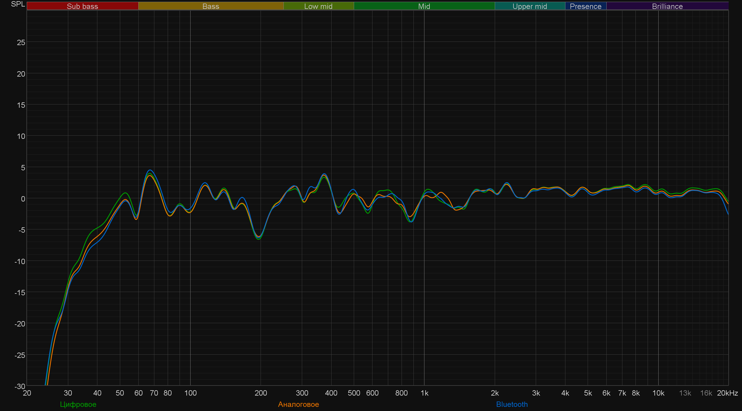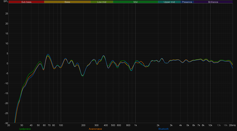 Конечно же, есть пики на частоте настройки фазоинвертора, без них никуда. Плюс немного «гудит» корпус, но это можно решить лучшей виброразвязкой с поверхностью, на которую установлены колонки. Мы же специально тестировали их без дополнительных аксессуаров. При цифровом подключении АЧХ особо не изменяется, что было заранее предсказуемо. То же самое можно сказать про аналоговое и беспроводное подключение, маленькая разница имеется, но вполне может быть объяснена погрешностями в ходе измерений.