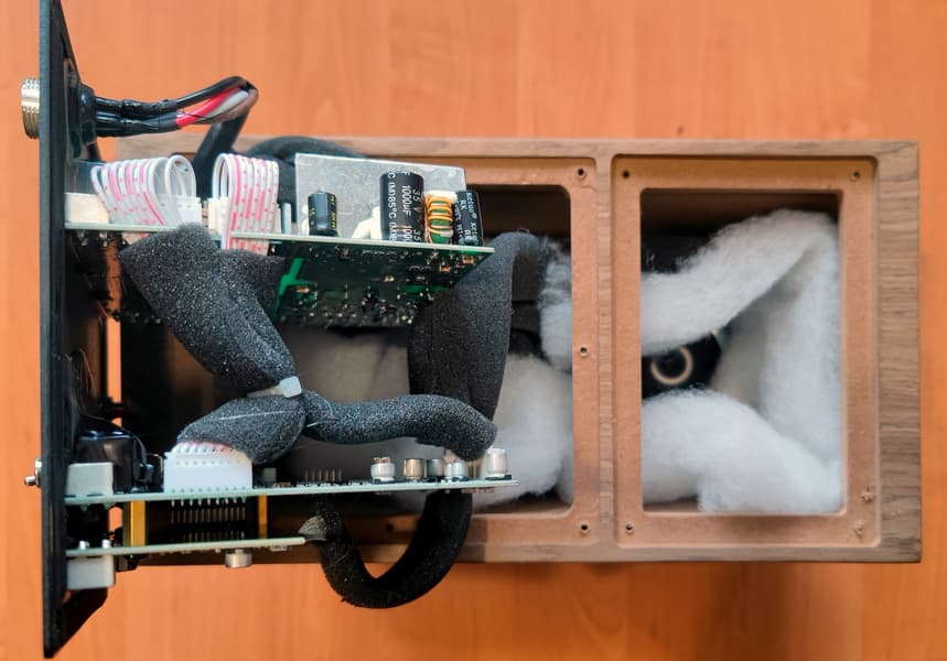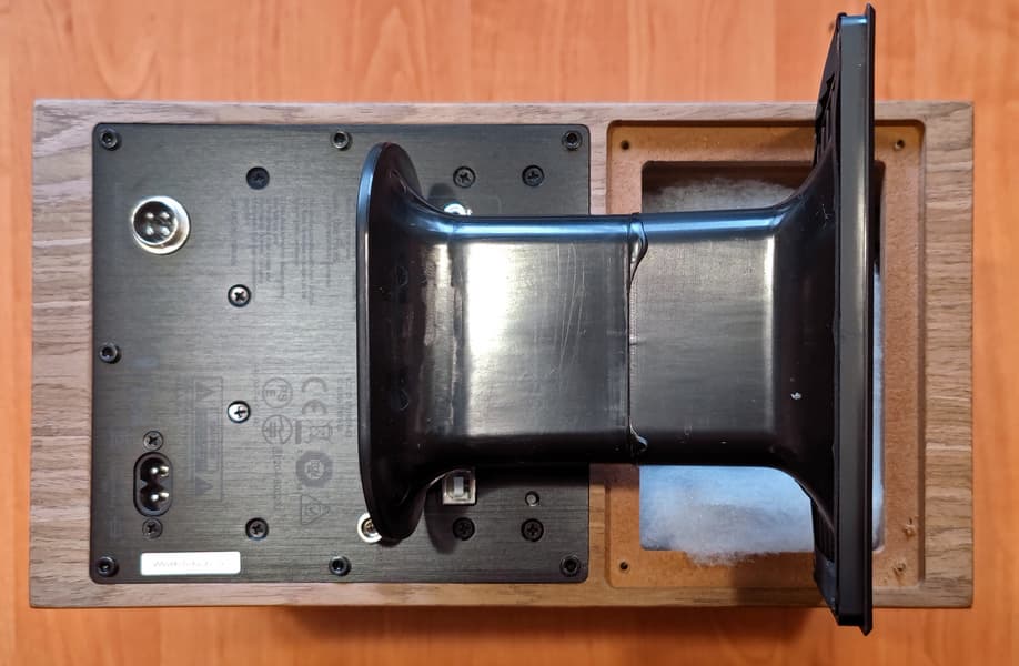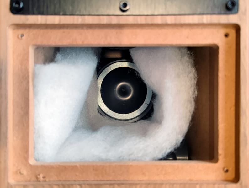 Заглядываем внутрь корпуса и видим тыльную часть высокочастотного динамика без какой-либо маркировки. Сразу отмечаем наличие достаточного количества демпфирующего материала.