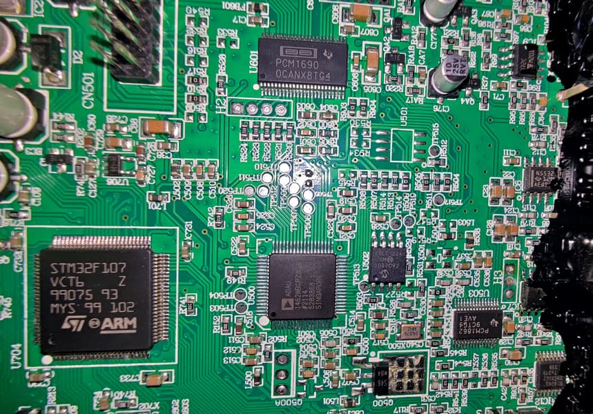 В качестве DSP задействована Analog Devices ADAU1462, выше нее размещен ЦАП PCM1690 принадлежащего ныне Texas Instruments бренда Burr-Brown. АЦП тоже имеется — PCM1862 авторства все тех же Texas Instruments.