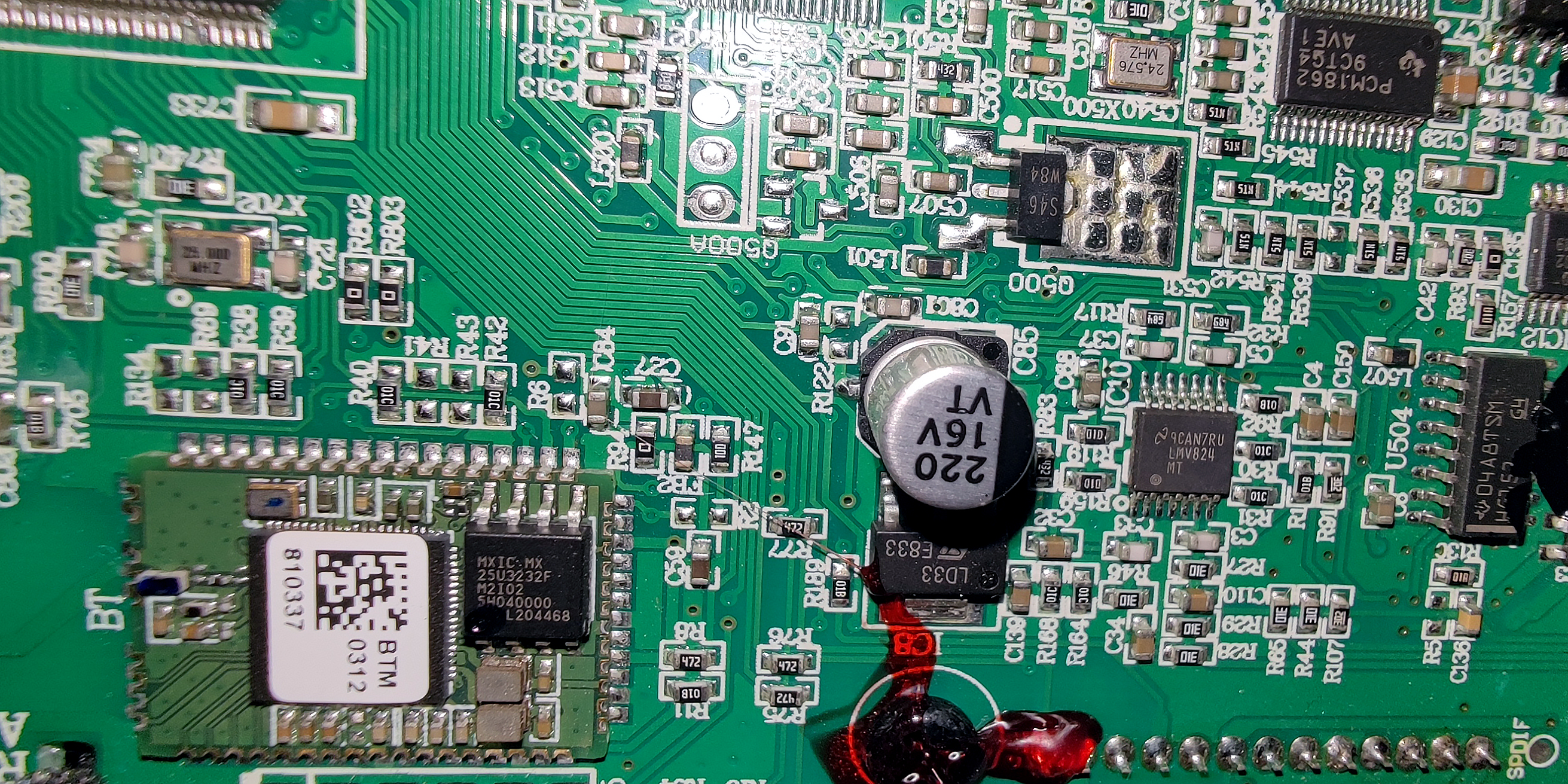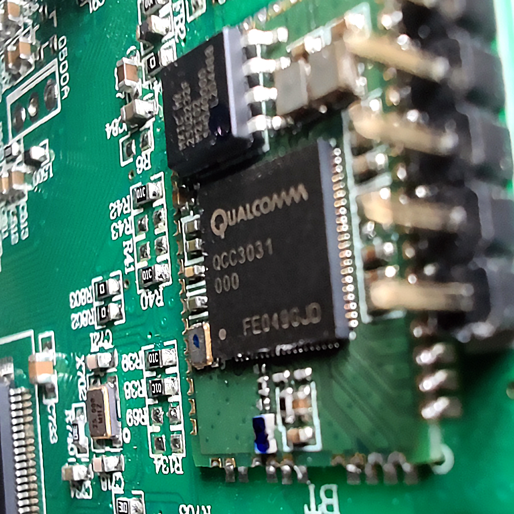 В нижнем углу платы размещен Bluetooth-модуль, чип на котором закрыт наклейкой. Аккуратно ее отклеиваем и видим Qualcomm QCC3031, в частности обеспечивающий поддержку aptX и aptX HD.