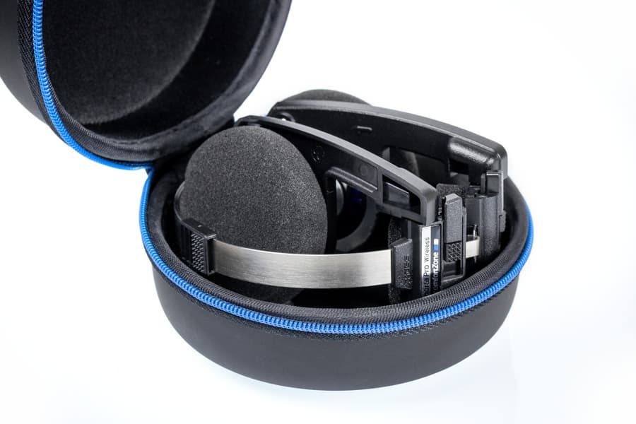 Наушники имеют складную конструкцию, позволяющую расположить чашки внутри оголовья. В таком сложенном состоянии наушники легко умещаются в специальный кейс на молнии, который входит в комплект.