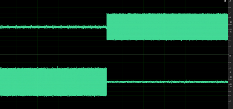 Следующий этап тестирования — проверка на наличие взаимопроникновения каналов. Для этого на используемом нами тестовом диске есть сигнал частотой 1 кГц, записанный в противофазе на разных каналах. Запишем сигнал, на всякий случай проверим, что воспроизводится он на одном уровне громкости.