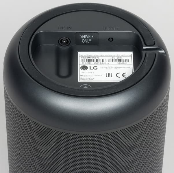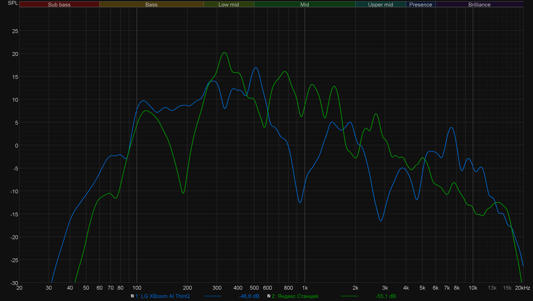 Несмотря на отсутствие в LG XBoom AI ThinQ отдельного низкочастотного динамика, бас в колонке присутствует в должном объеме. При этом басовые партии звучат достаточно собранно и четко, в отличие от «Яндекс.Станции», известной своим «бубнящим» звуком. Средние частоты присутствуют, но детализации им слегка не хватает. Зато они не теряются за низкими и хорошо различимы даже в насыщенных оркестровых записях. Провал в районе 800 Гц, хорошо заметный на графике АЧХ ниже, на слух воспринимается не так остро. В высоких частотах нет излишней резкости, звук высоких тарелок присутствует, но не слишком выделяется. В целом звучание оставляет очень приятное впечатление. Опять же если помнить, что мы говорим о портативной монофонической акустике. Кстати, объединение двух колонок в стереопару не поддерживается.