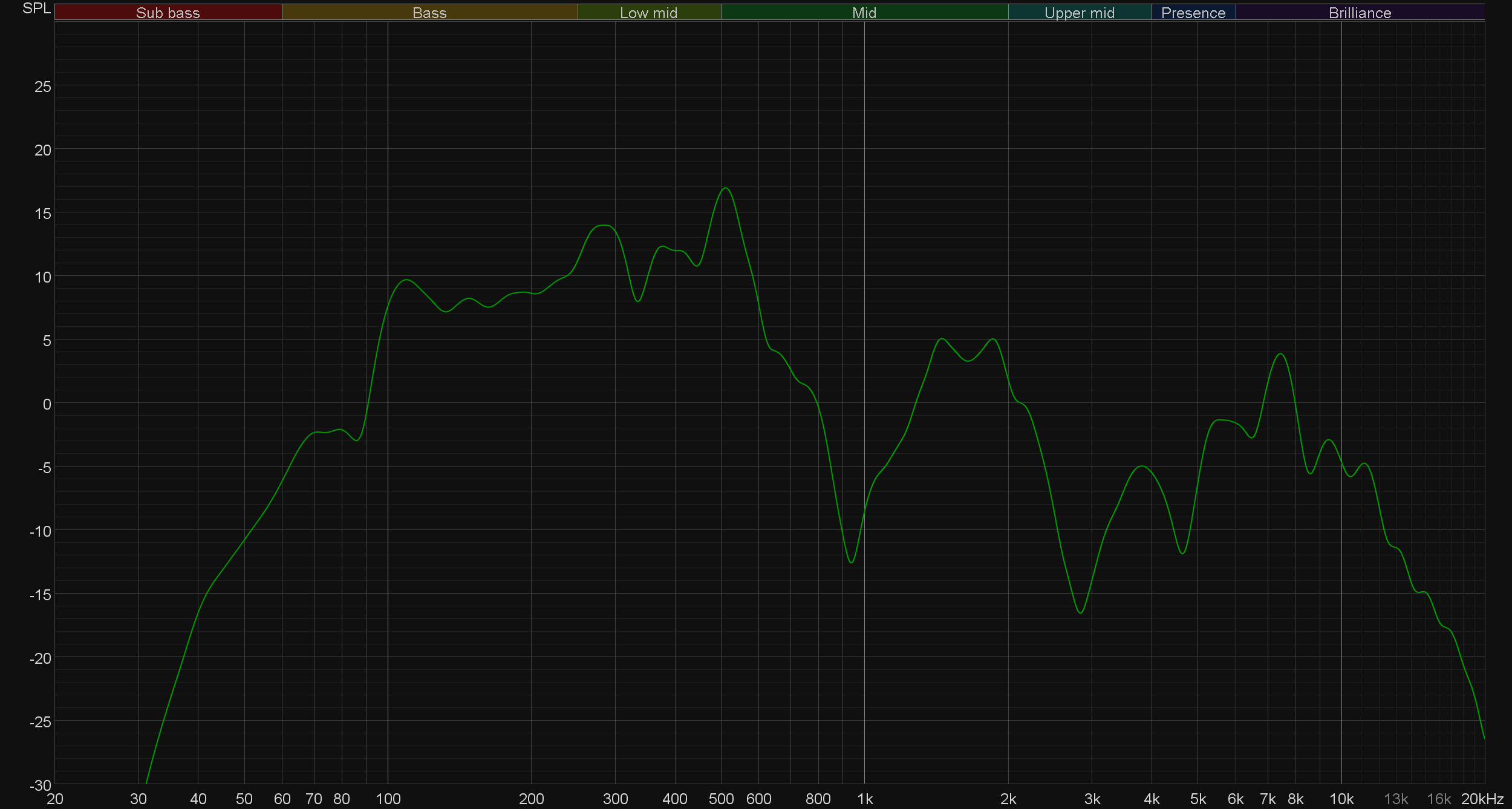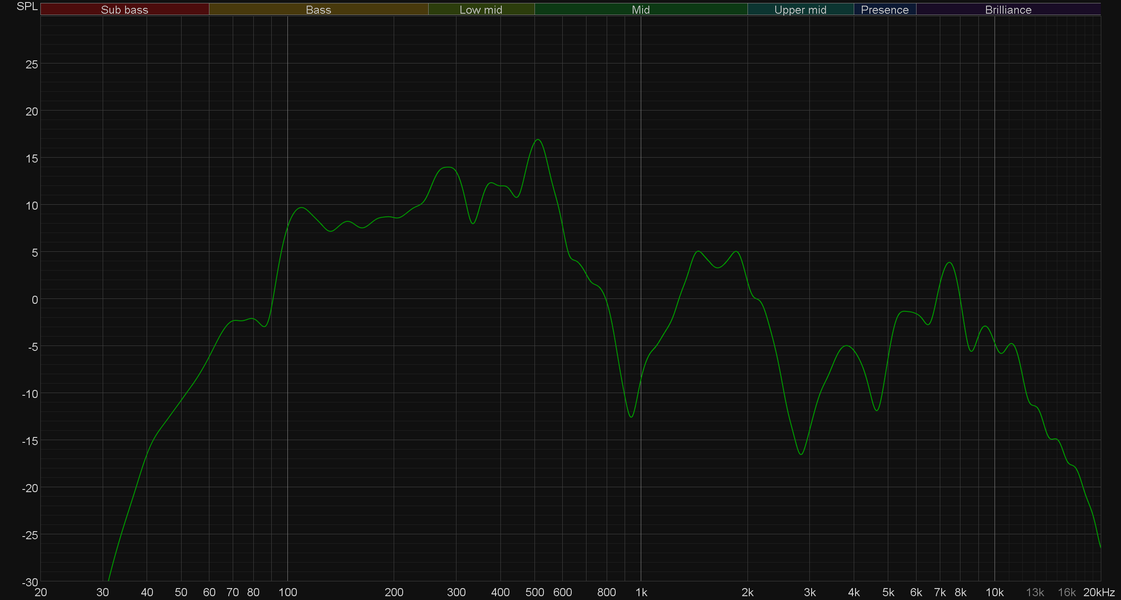В силу технических ограничений для получения графика использовалось Bluetooth-подключение, что следует иметь в виду, при воспроизведении потокового аудио субъективно немного, но отличается. Как и в большинстве тестирований компактной акустики, были проведены две серии измерений. Первая – при положении микрофона по нормали к колонке на расстоянии примерно 60 см. Во второй микрофон был смещен вверх под углом 45°, так как подобные устройства часто находятся на уровне пояса слушателя. Разница в данном случае оказалась несущественной, потому приводить оба графика не будем – ограничимся одним усредненным.