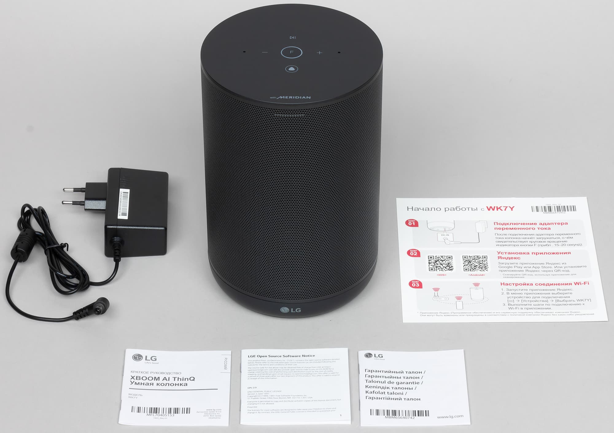 В комплект поставки входят сама колонка, инструкции и гарантийный талон, а также блок питания.