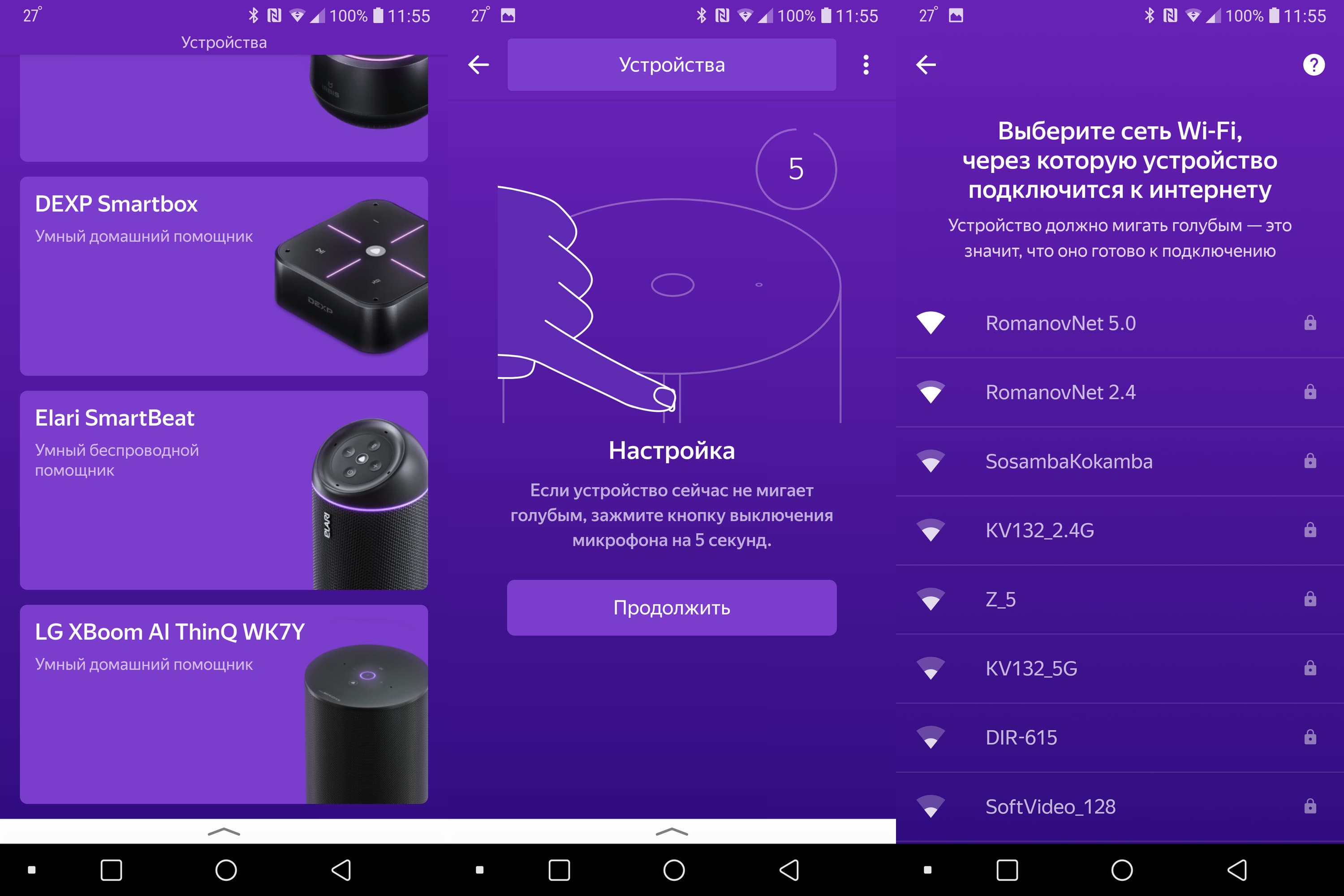 Подготовка LG XBoom AI ThinQ к работе практически не отличается от того, что мы уже видели у «Яндекс.Станции». Скачиваем приложение «Яндекса», заходим в раздел устройств, находим подключаемую колонку — она в самом низу списка. Проверяем, что колонка находится в режиме сопряжения, после чего выбираем сеть для подключения.